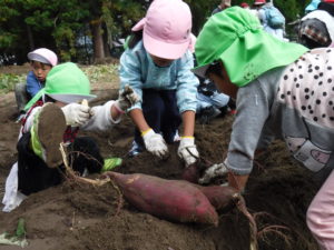 交流も2回目というこで子どもたちも地域の方と一緒にやきいも会を行えることを楽しみにしていました。さつまいも掘りでは「大きいのがほれたね」「上手だね」などと地域の方にたくさんほめて頂きとても嬉しそうでした。