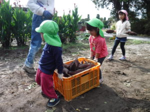 こんなにたくさんのさつまいもがとれました 「重いでいっしょに持ってやるな、せーの」
