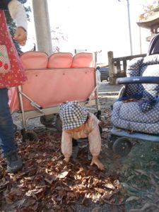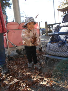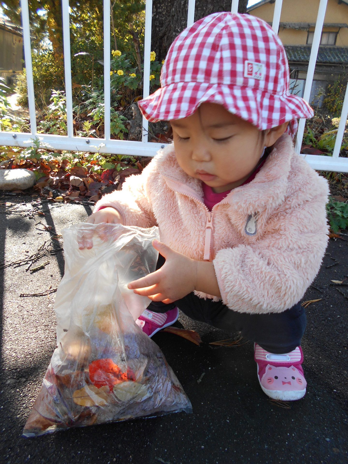 「いっぱーい。」ひかちゃん、袋に小さな手で葉っぱをいっぱいに詰めています。
