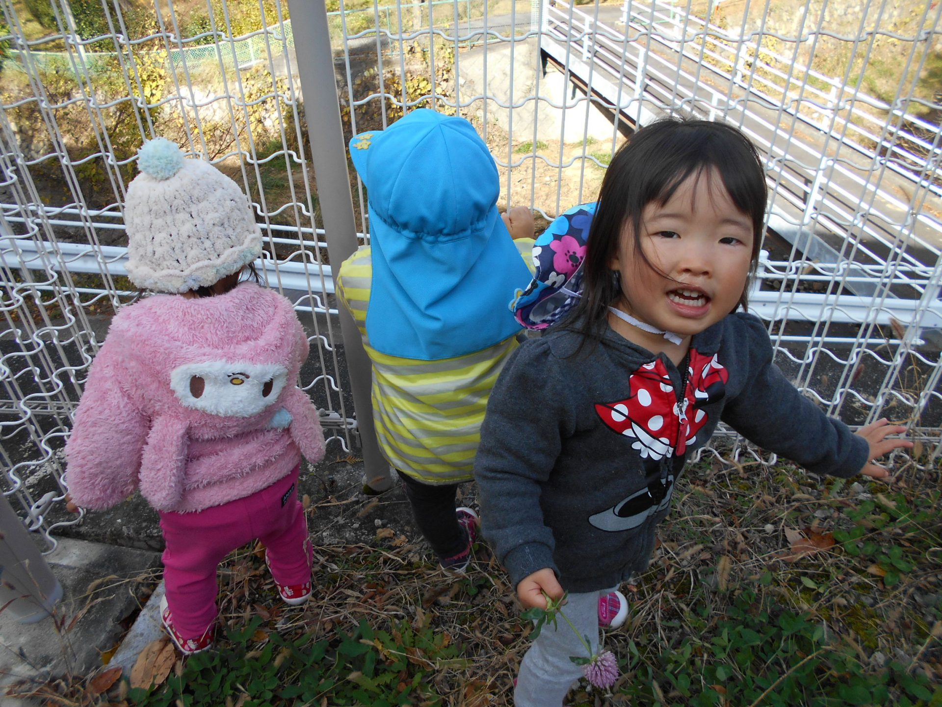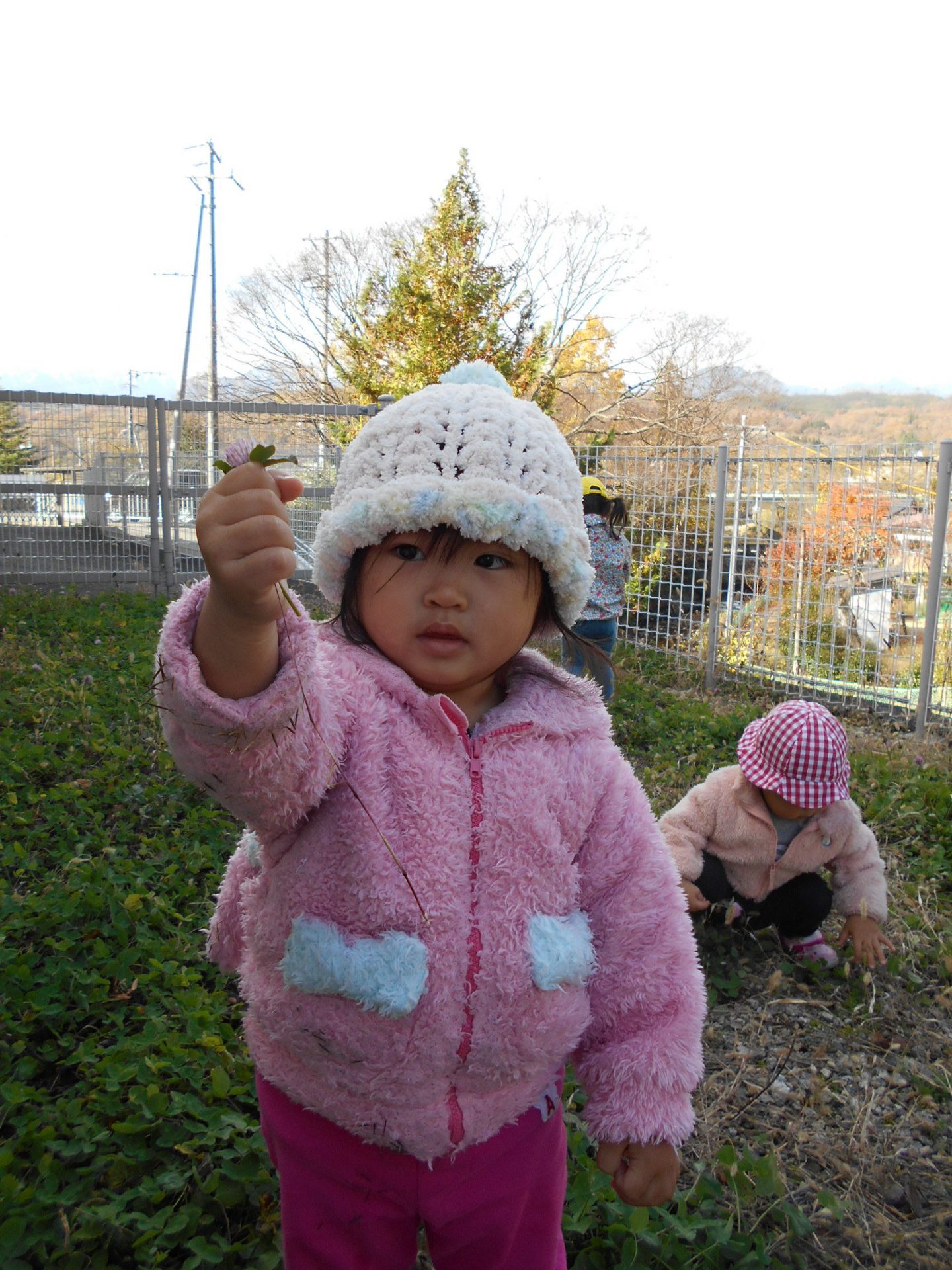 ひよこぐみさんは、外へ出るのが大好き。園庭で空地で、散歩先で、駐車場のわきで様々な物を見つけて見せてくれます。