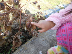 散歩の途中で見つけた綿の木、「あーこれー」小さな指で、そーっと綿を触っています。