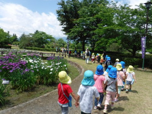年中さんは年少さんと分かれて、さらに、あやめ公園まで歩きました。