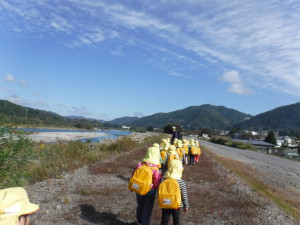 一列になって大きな川の上を渡ります。 みんなで散策… 『何かあるかな?』