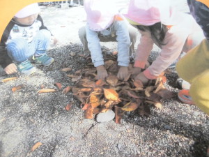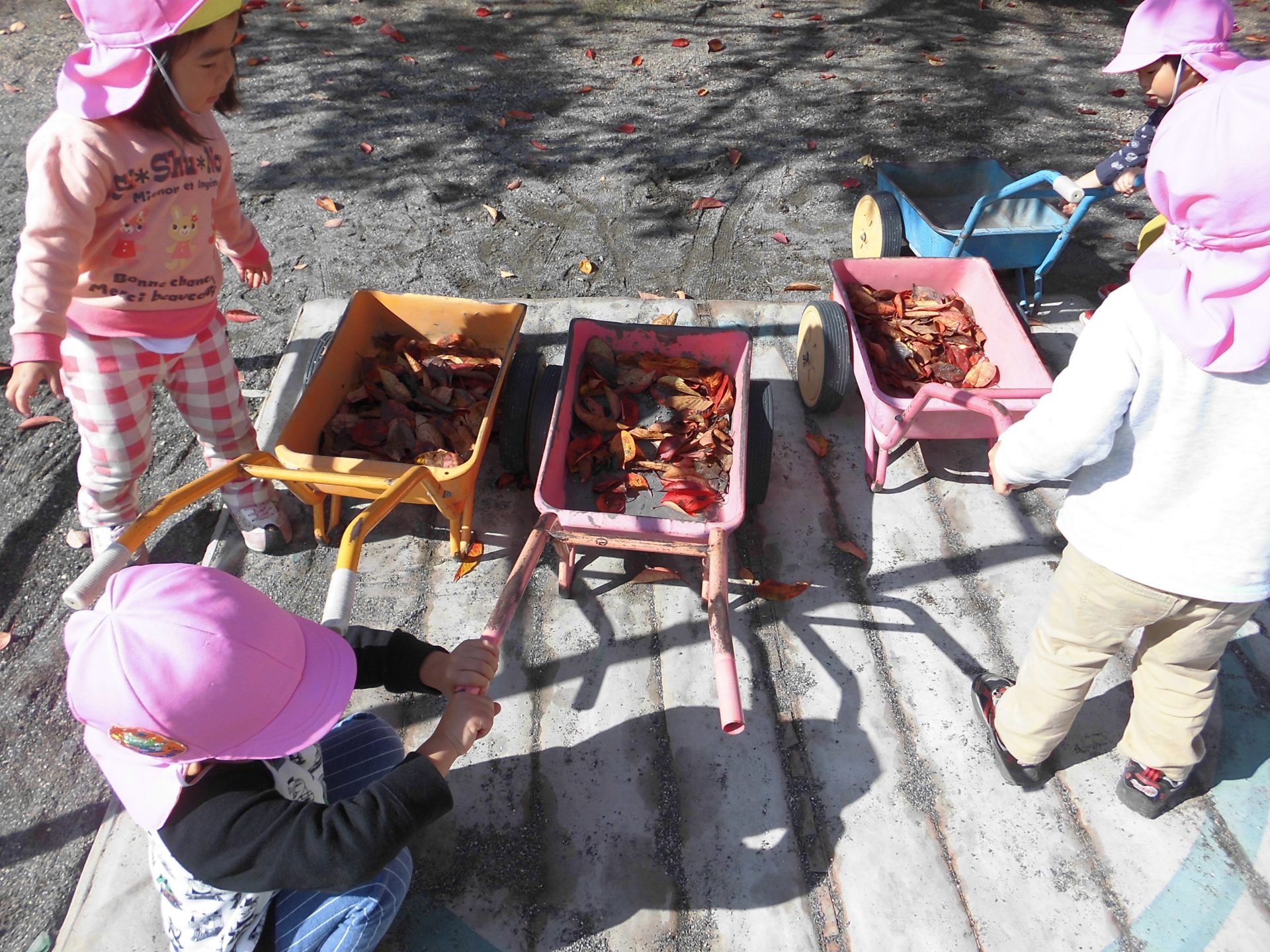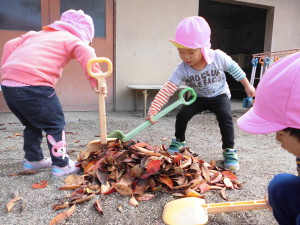 桜の木の葉を集めて、2才児の子どもたちが〖やきいも会ごっこ〗を楽しんでいました。