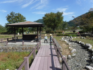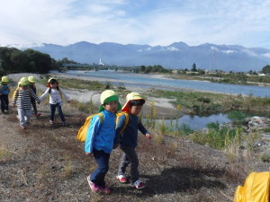 明科南保育園の横には、ニジマスの泳ぐ前川が流れ、北アルプス連峰の大パノラマを望む堤防の西には豊かな流れの 犀川が流れ、山紫水明の自然の恵みの中で、子どもたちの心も豊かに育っています。