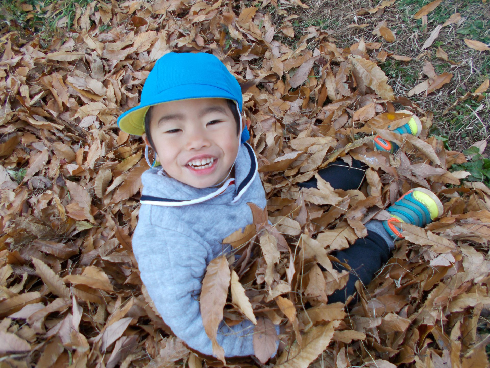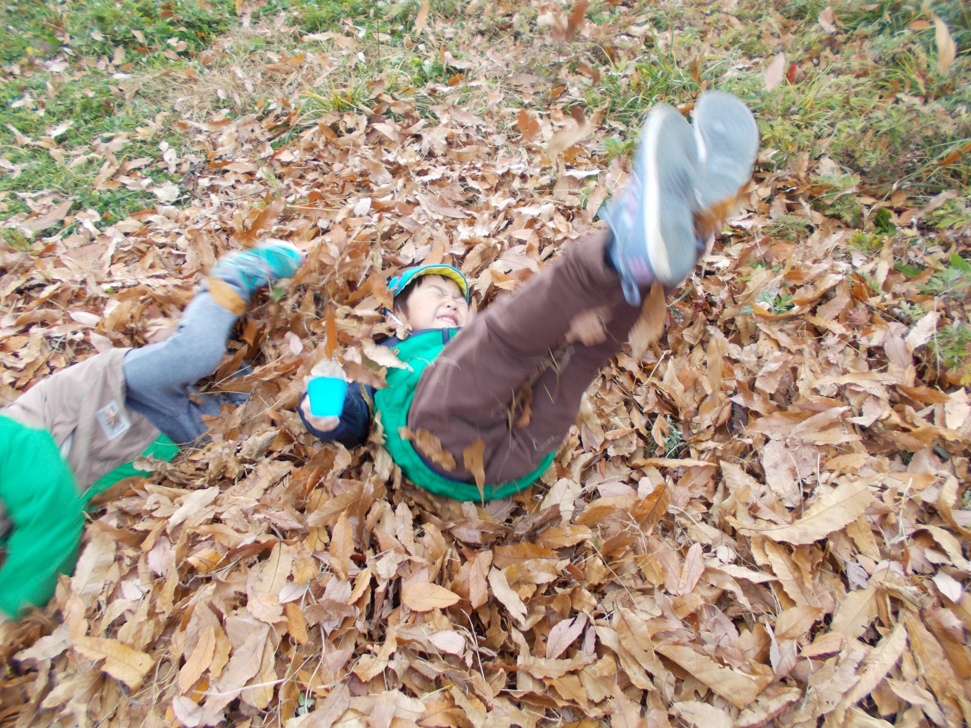 落ち葉集めをし、触ったり転がったりすることで、落ち葉の感触や音色などに気付き、体全体で遊ぶことが出来た。
