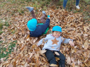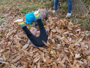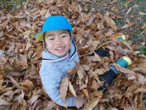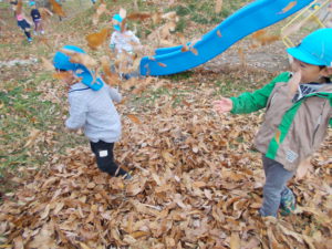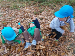 保育園のお庭には、葉っぱがいっぱい落ちてるんだね