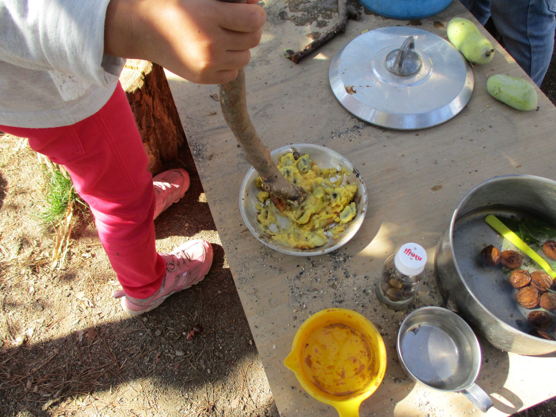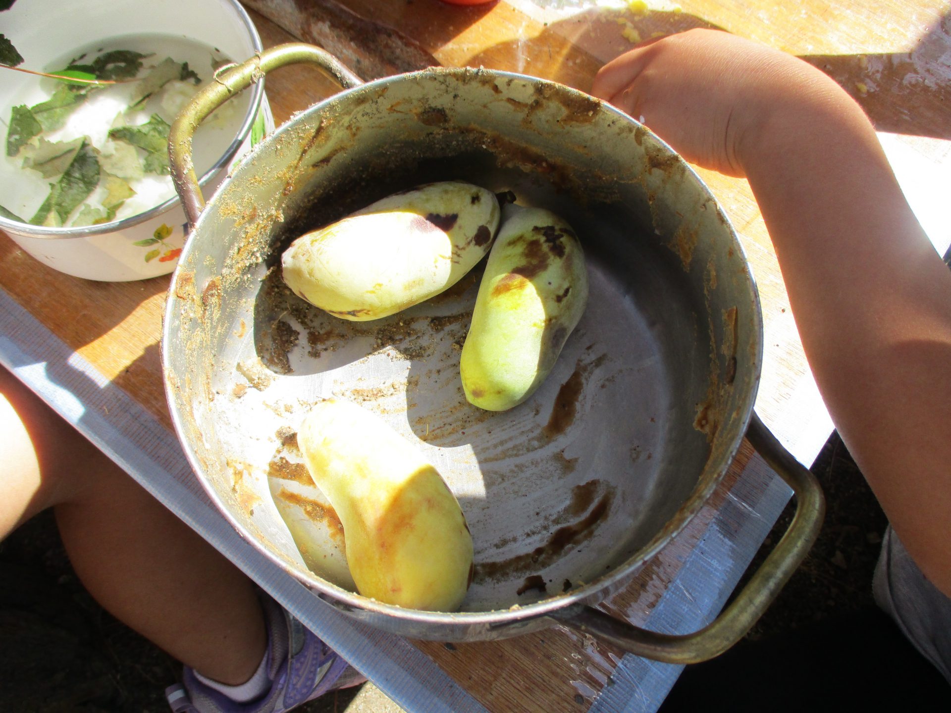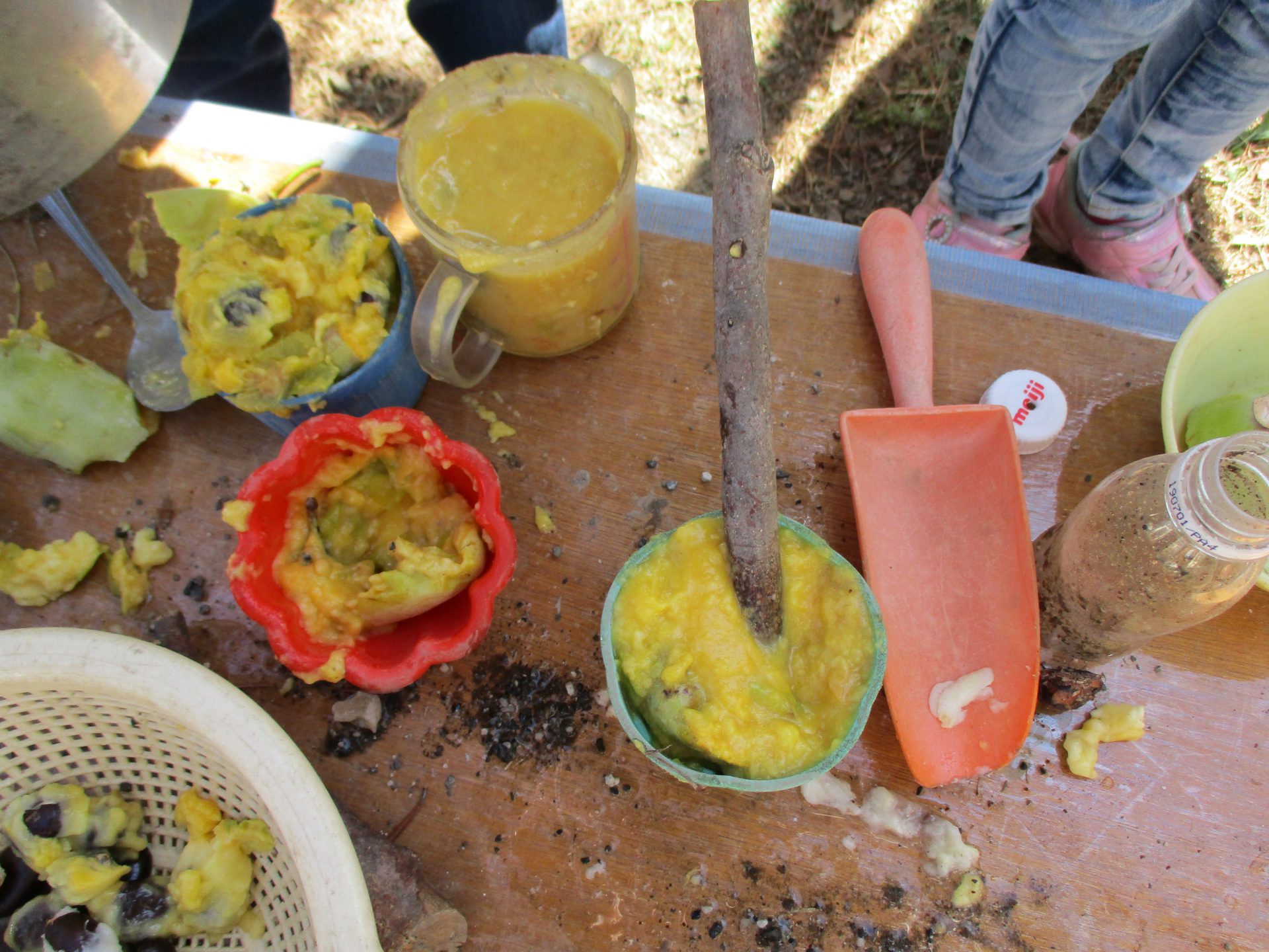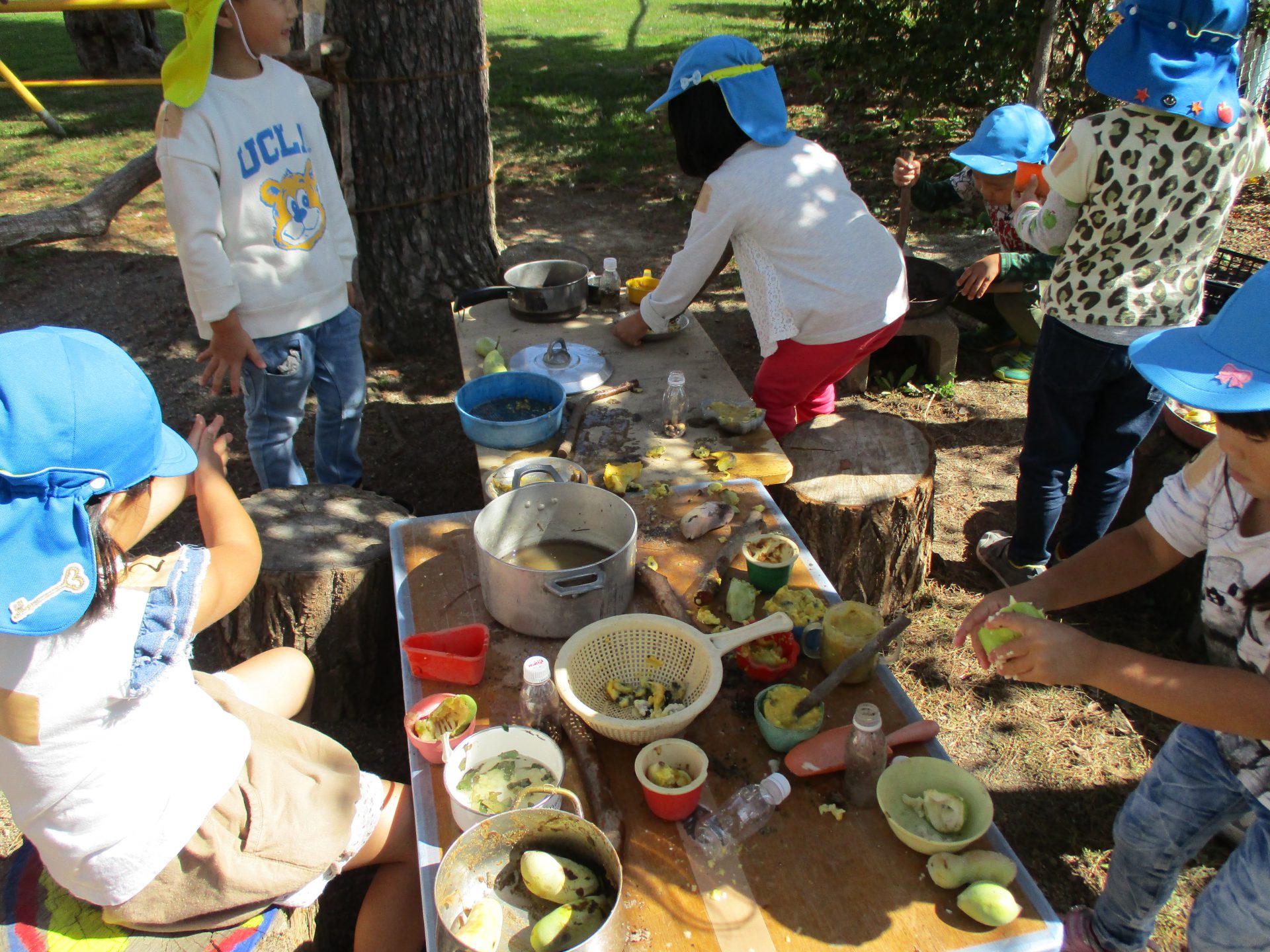 「くさいね」など…料理作りをしながら、ポポの実が柔らかいこと、潰しているとドロドロと液状になること、匂いがあることなど、いろんな発見を楽しみました。