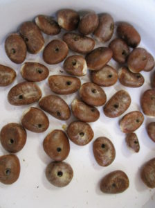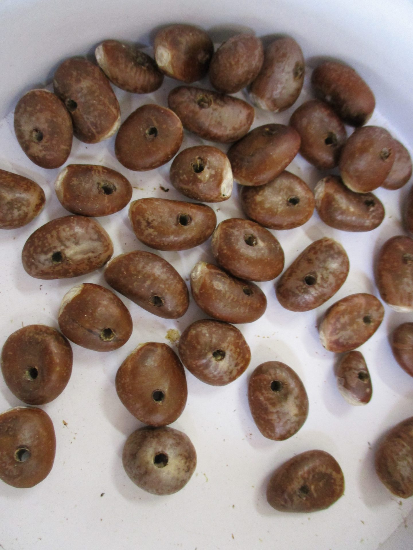 乾燥させ、種に穴をあけ、クリスマスリースの飾りに使いました。