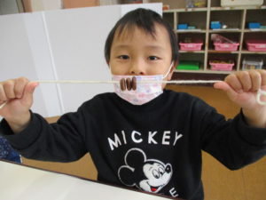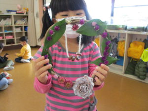 遊びの一つひとつが子ども達にとってかけがえのない物(種でさえ)だという事を家庭にも伝えたく、クリスマスリースに用いました。家に持って帰り、ポポの実で遊んだこと、その種を取ったことなど、会話が広がってくれればいいな・・・と願っています。