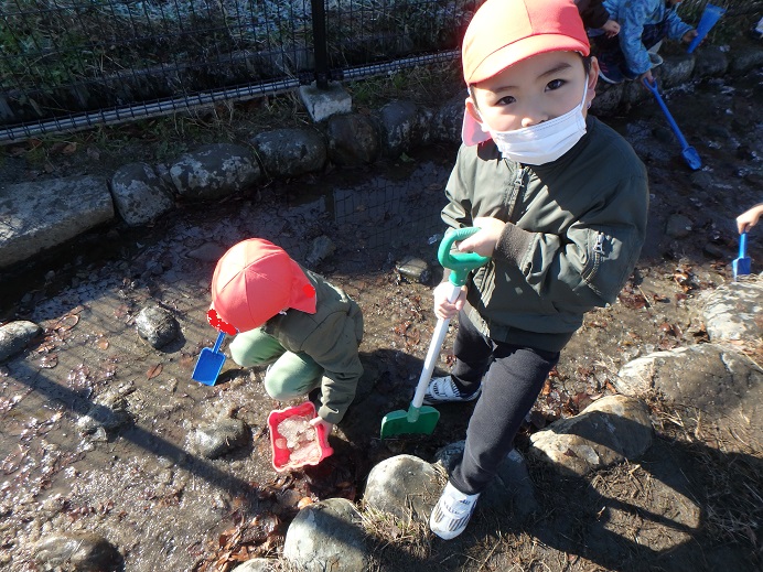 子ども達はさっそくビオトープに入り、シャベルで割ったり、踏んだり、かけらを拾ってみたり、とても楽しそうです。