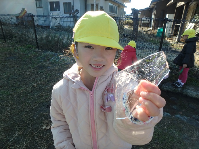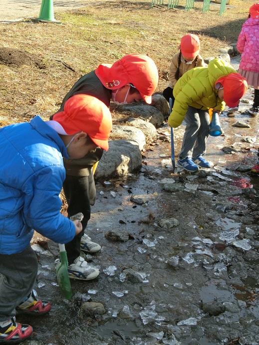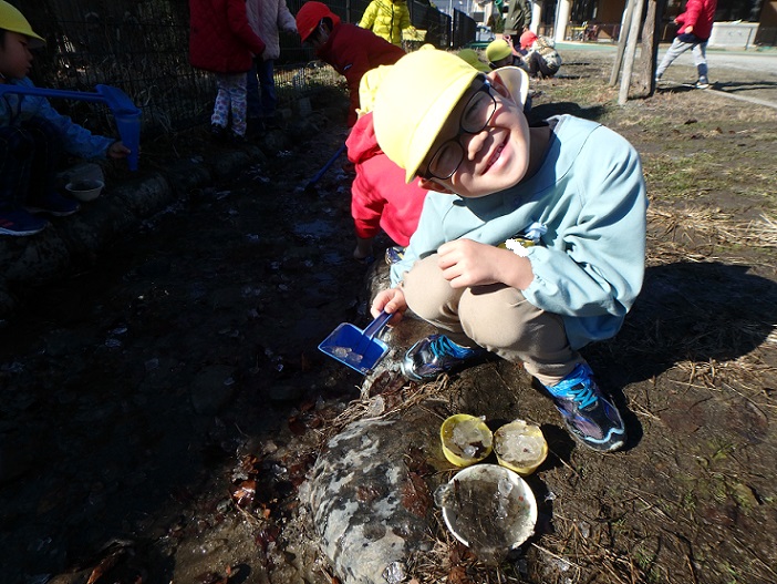 氷の冷たい感触を感じたり、踏んだり割ったりして踏む感触や音を楽しんでいました。