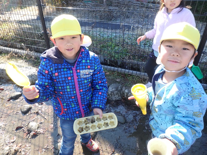 シャベルなどの道具を取り入れたことで、子ども達の感覚遊びの幅が広がり、氷を型にはめて花の形の氷を作るという発想が生まれたのだと思います。遊びを豊かにするための環境設定の大切さを感じました。