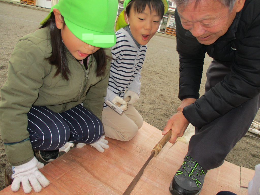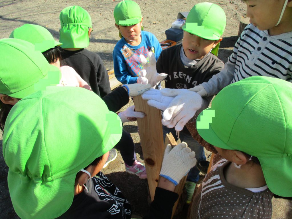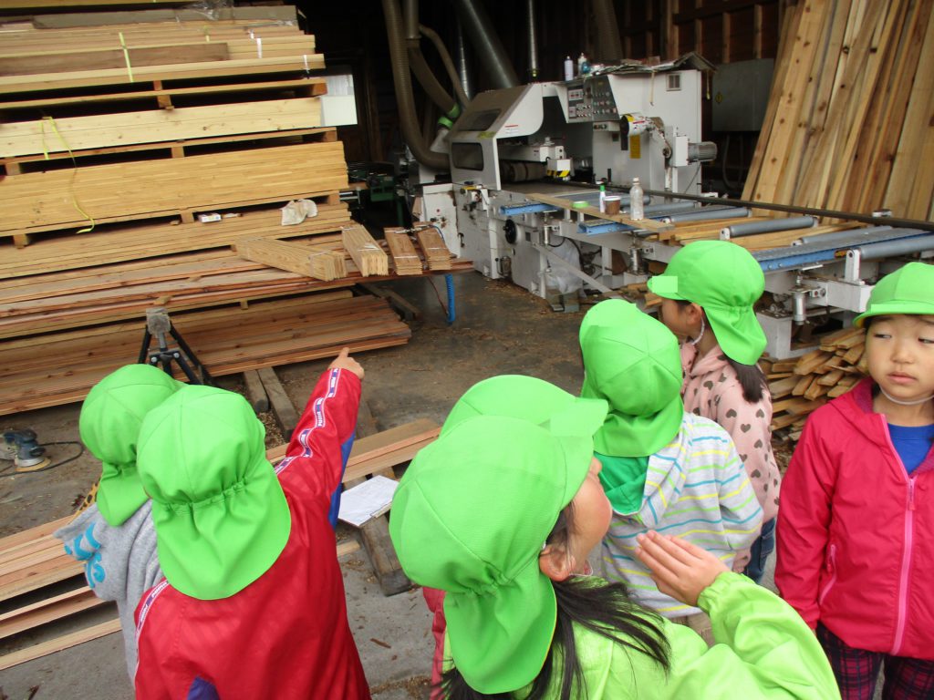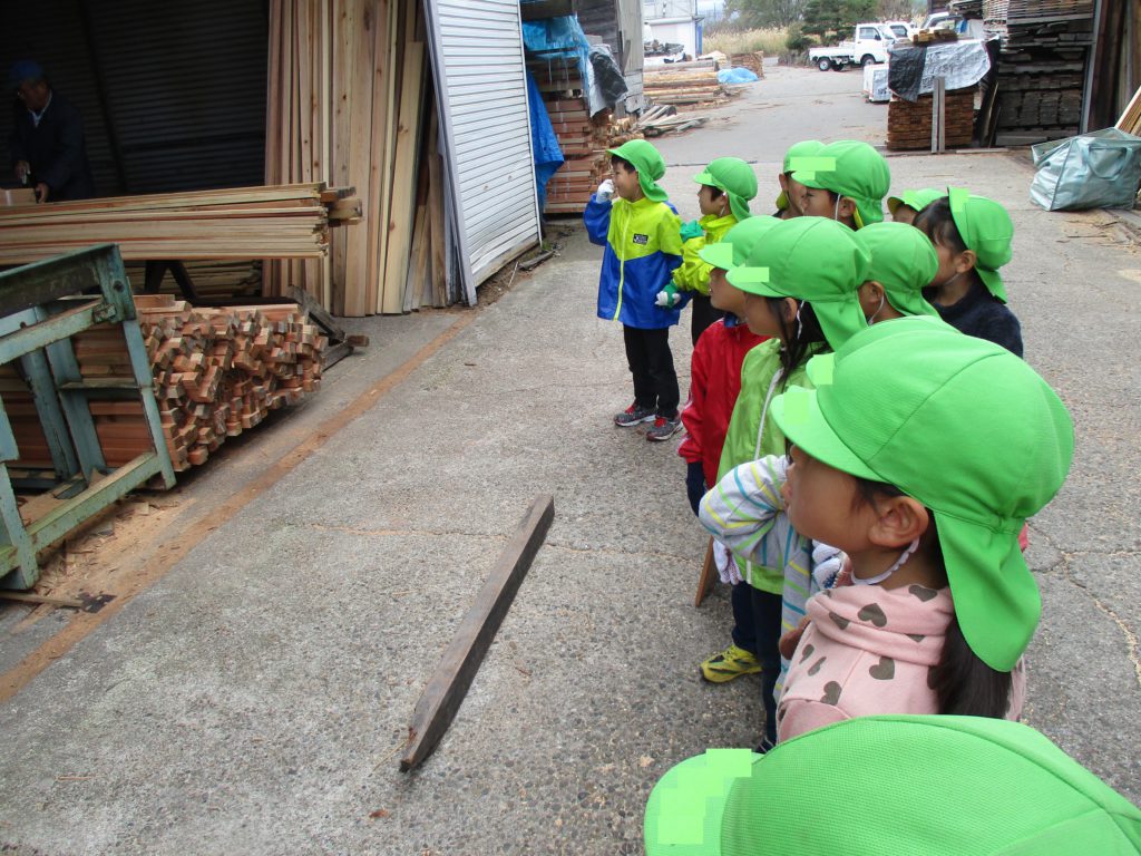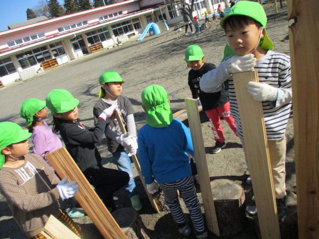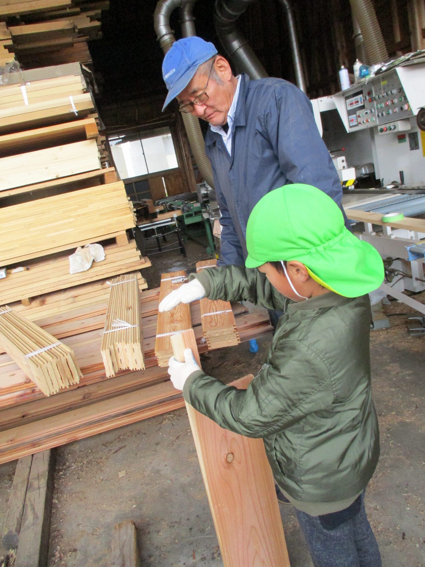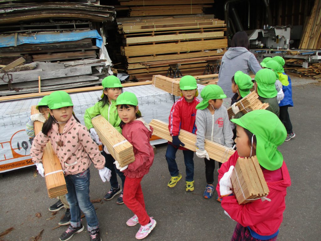 お仕事を見せてもらっている間に「持っていってもいいよ」と。頂いた板はみんなで力を合わせて保育園まで持って帰ります。