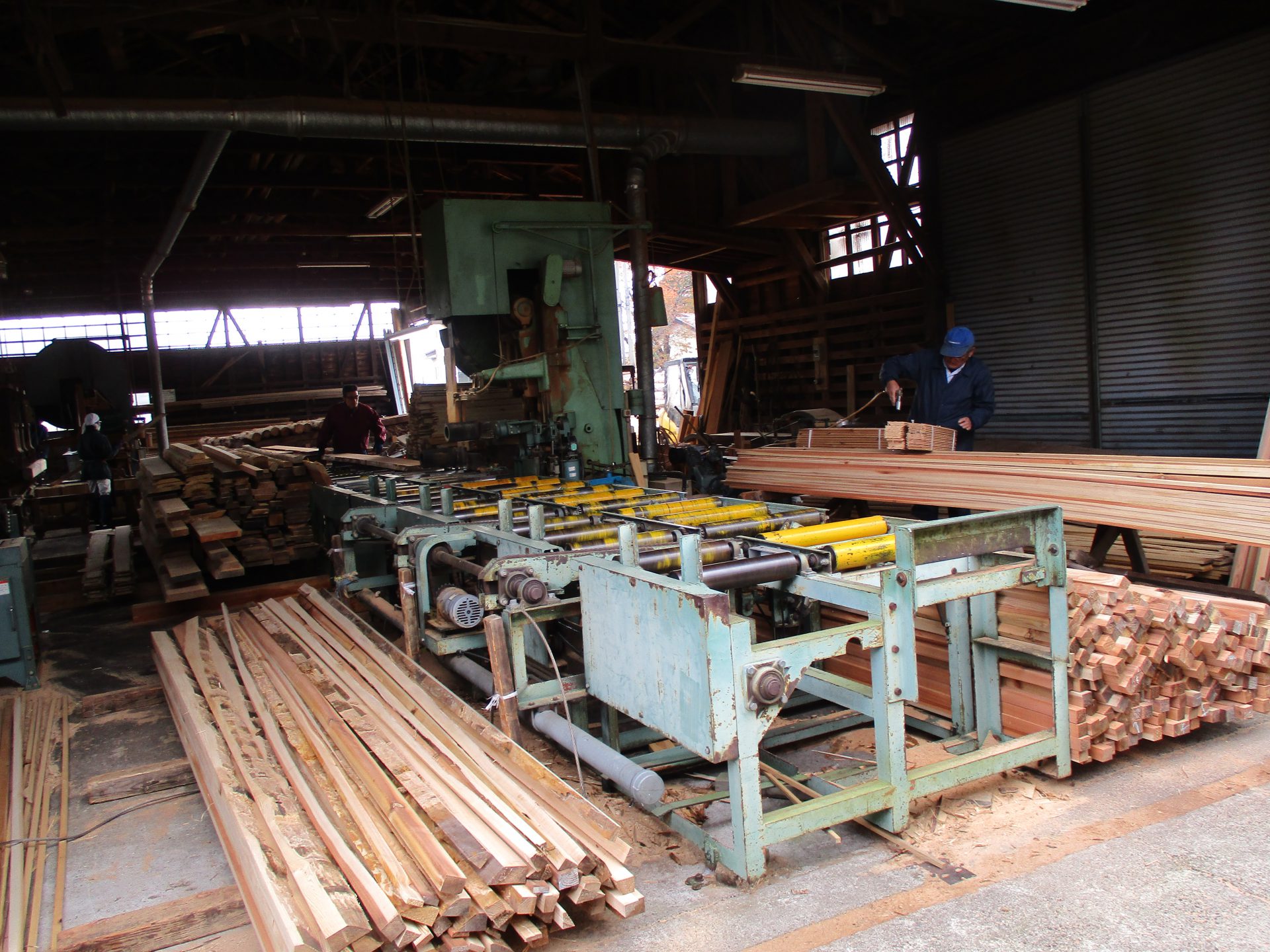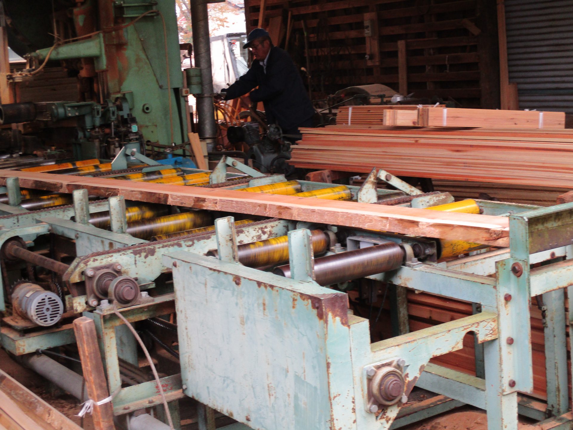 奥の方から板が流れてくると同時にのこぎりの刃で切られてきて