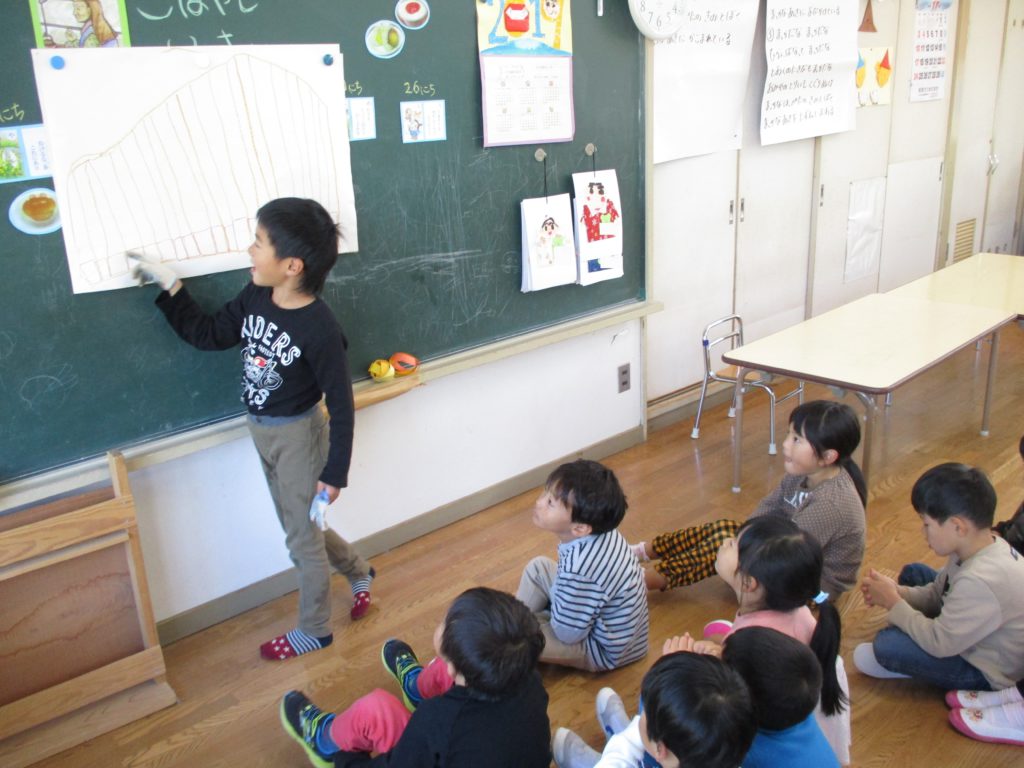 この日の話の中で、”雪が落ちるようにするには屋根はどうしたらいいか”という話し合い。壁と屋根の具合も考えながら作らないといけないということを設計図を見て気がついた子ども達。