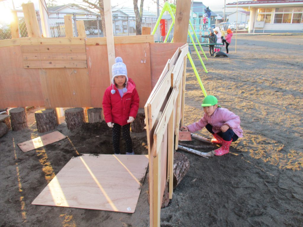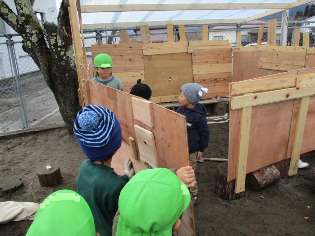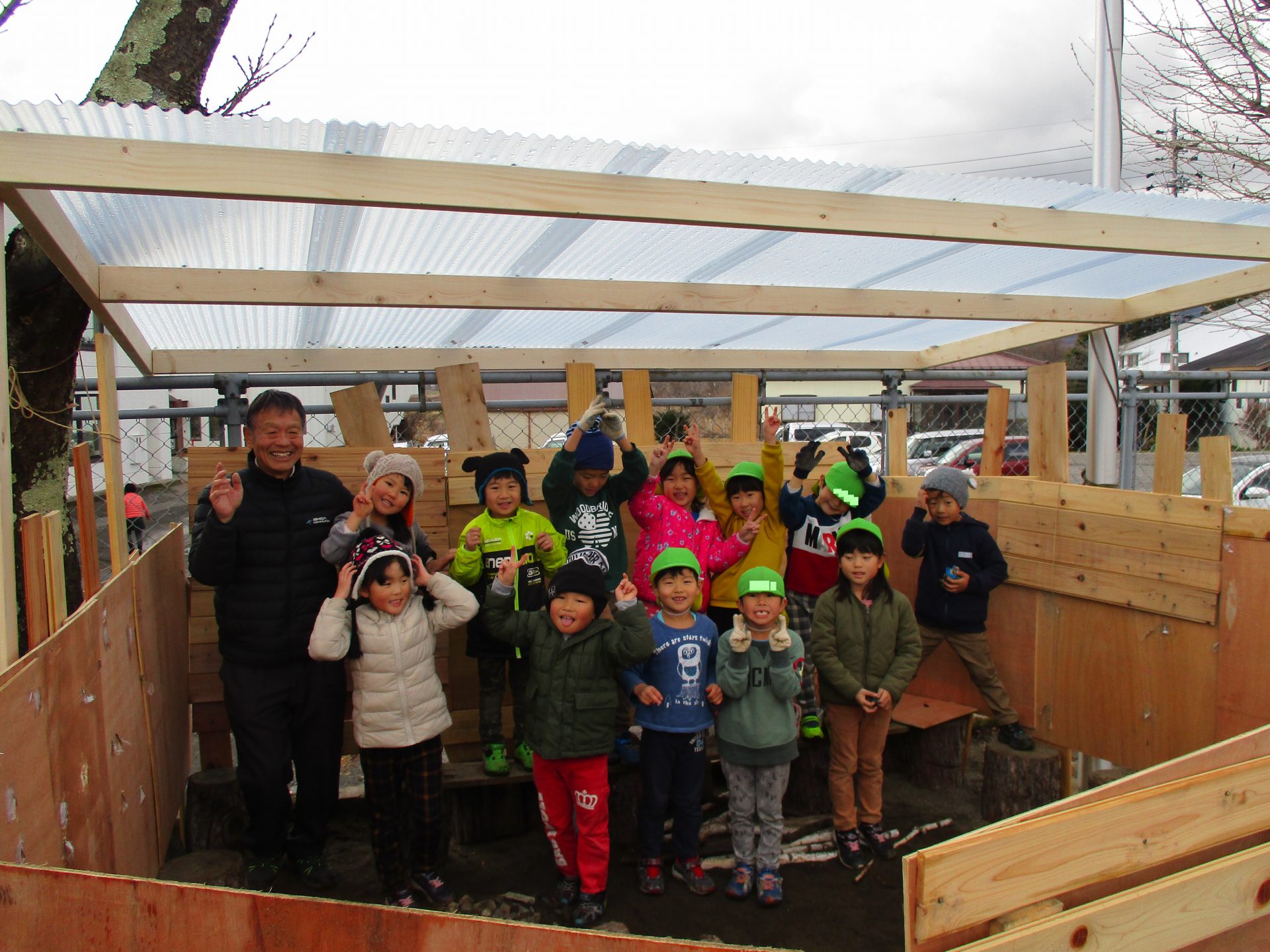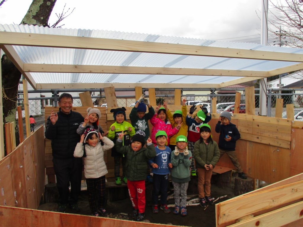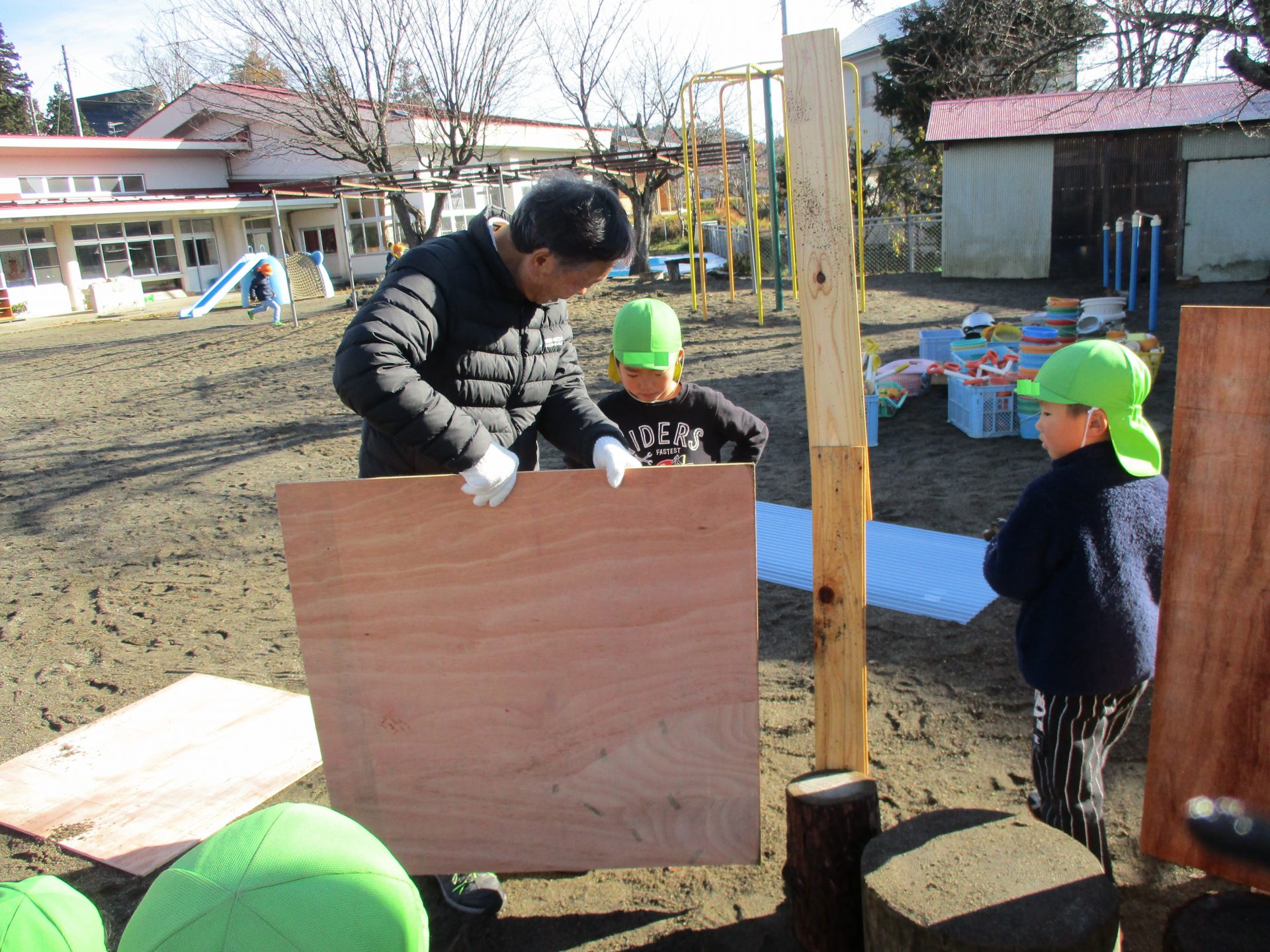 できた家ではもう、子ども達はごっこ遊びが始まっています。出来上がった家で子ども達が残り少ない保育園生活の中で思う存分楽しめたらいいなと思います。