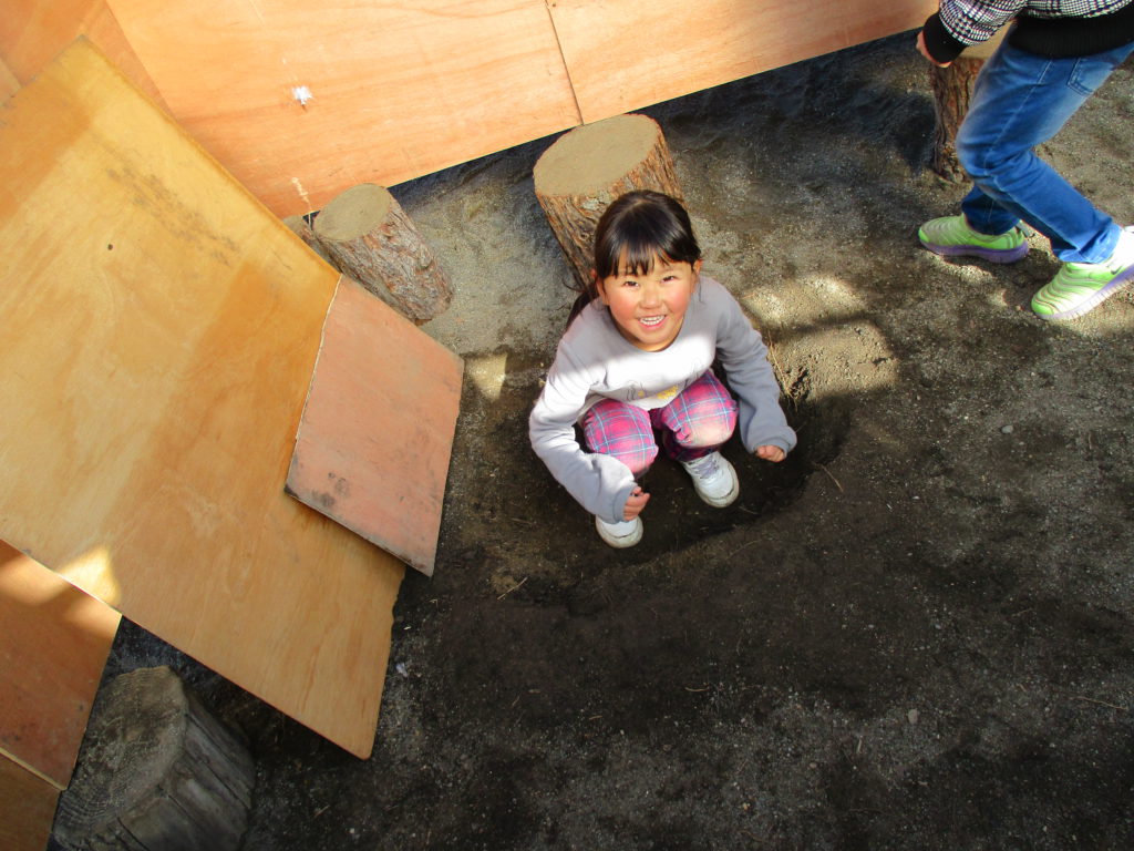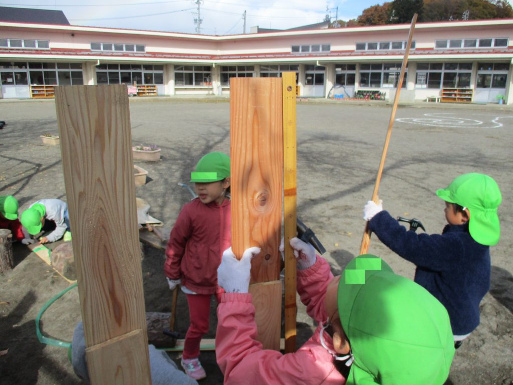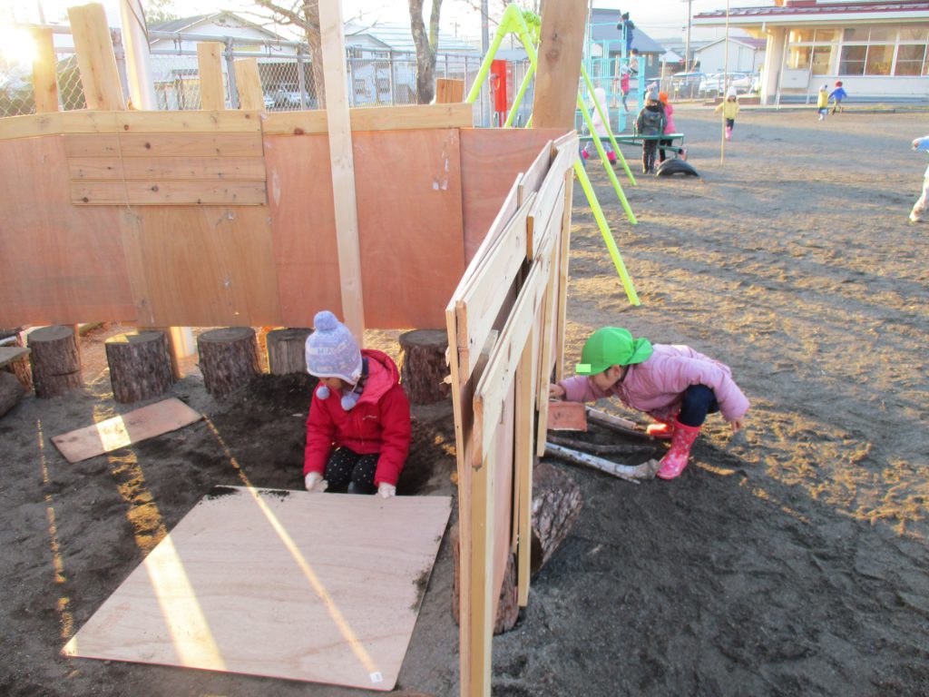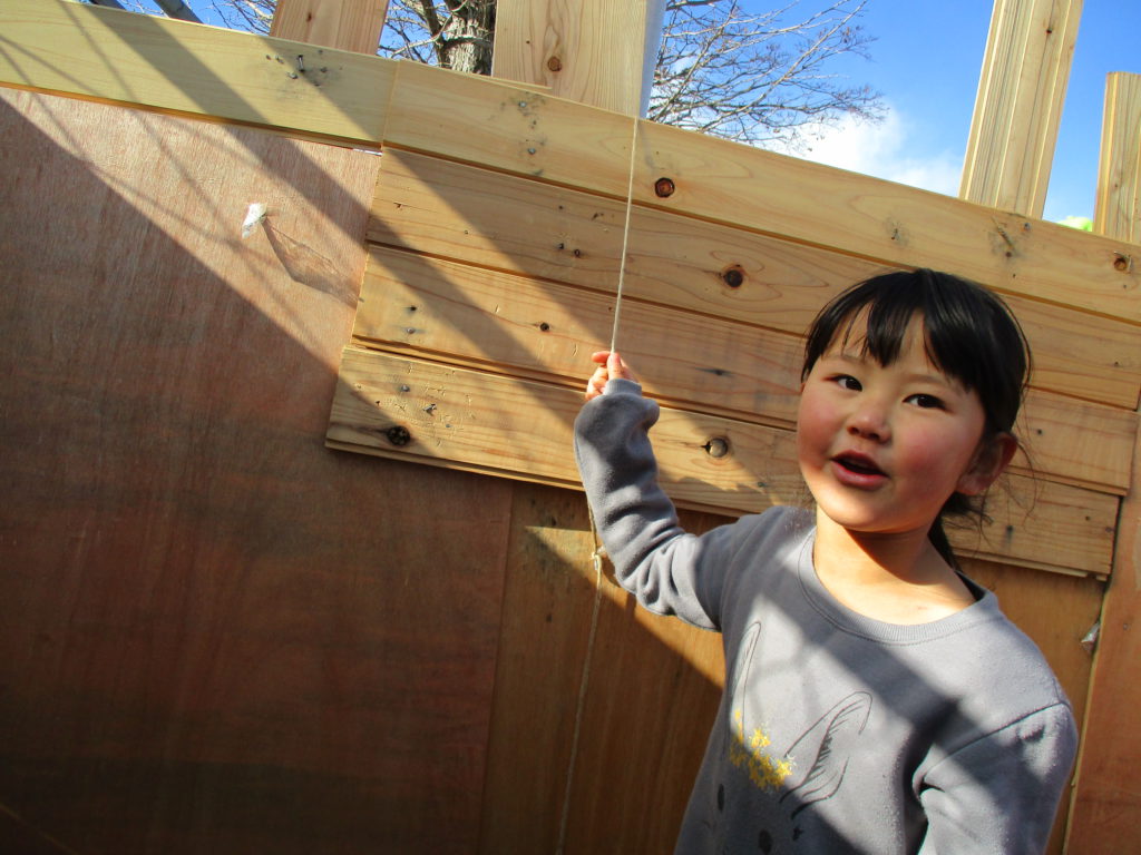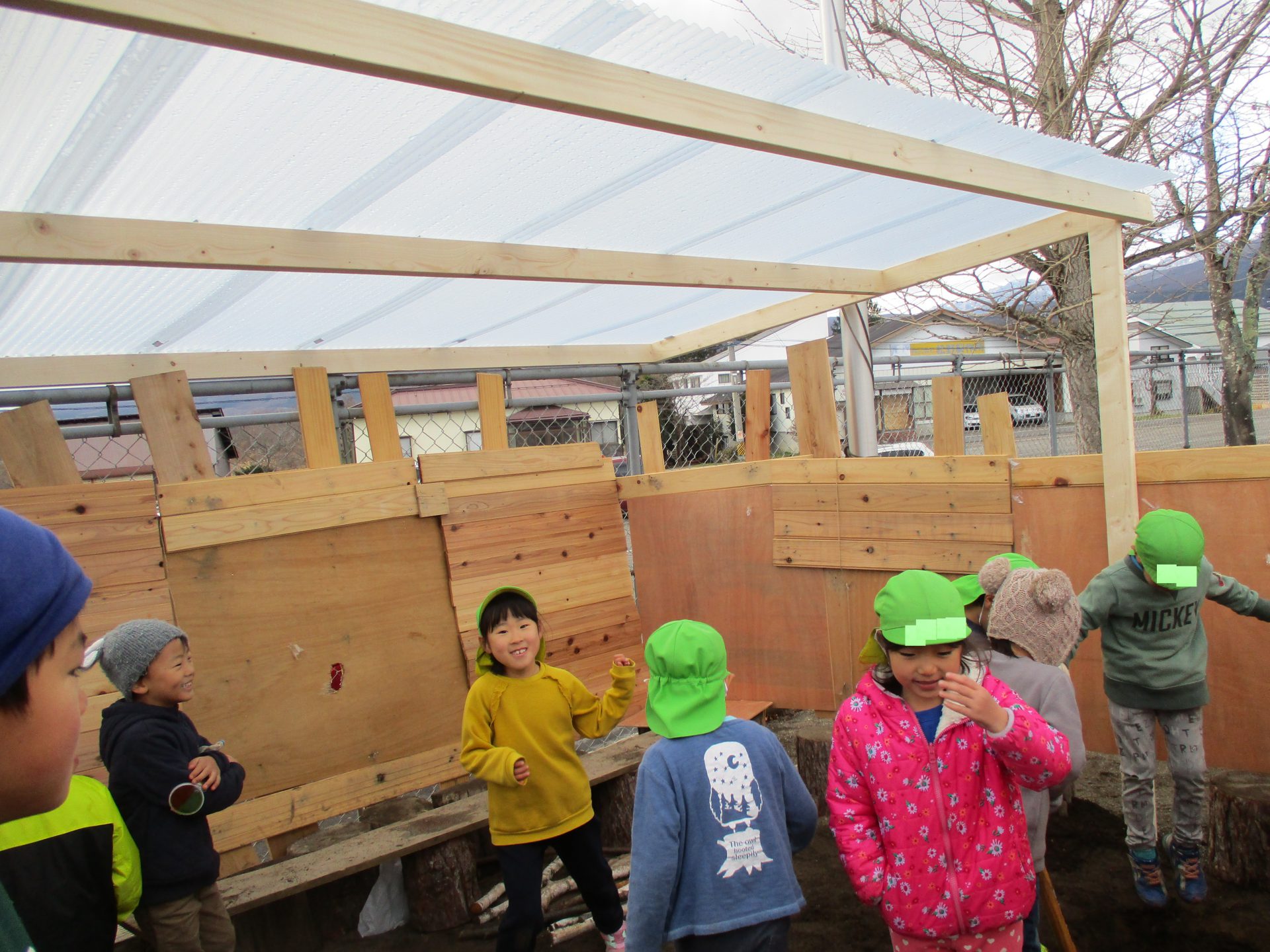 できた家ではもう、子ども達はごっこ遊びが始まっています。出来上がった家で子ども達が残り少ない保育園生活の中で思う存分楽しめたらいいなと思います。