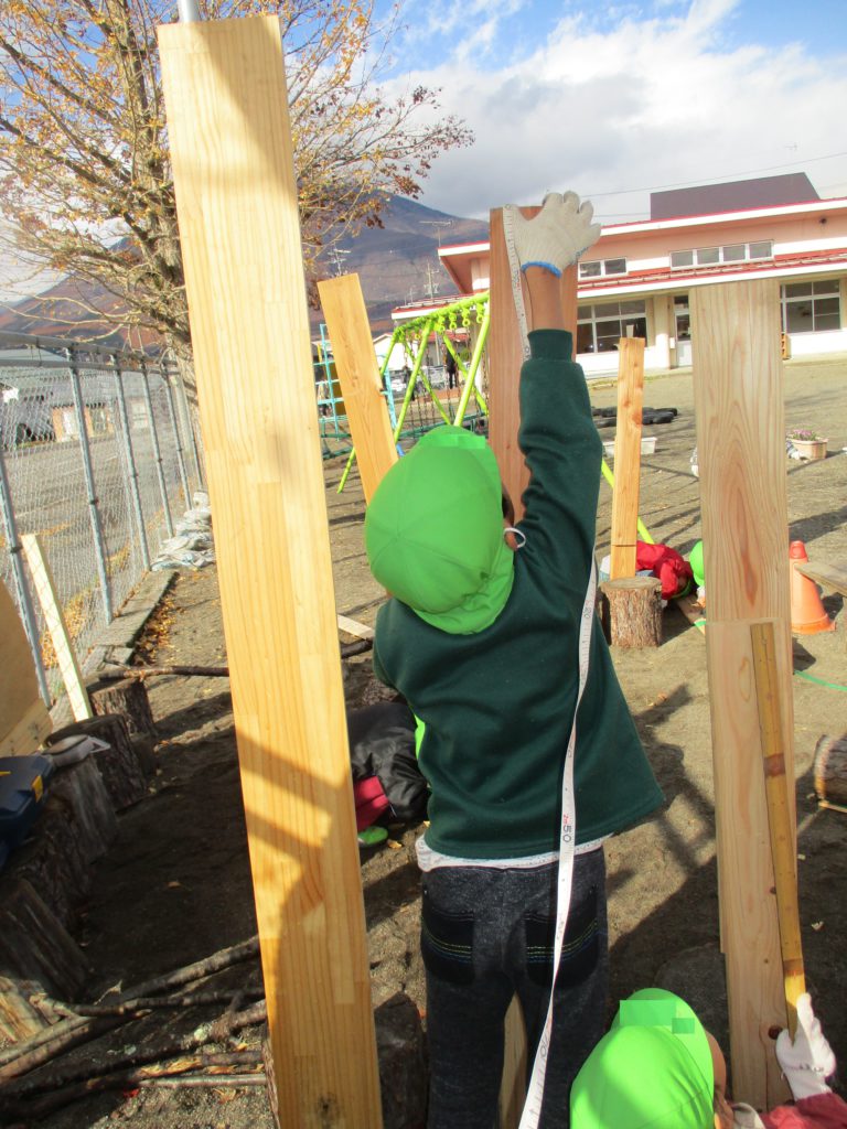 「この壁の板はこのくらいの高さだね」「じゃあ、これよりも高くしていかないと」と手で比べてみたり