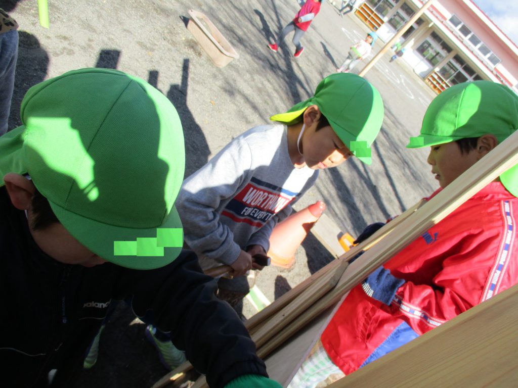 おじいちゃんと一緒に作業している中で、子ども達は今まで金づちで作っていました。が、作業する中でベニヤ板を釘打ちするのはなかなかの力が必要。