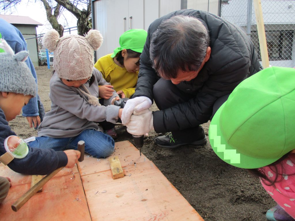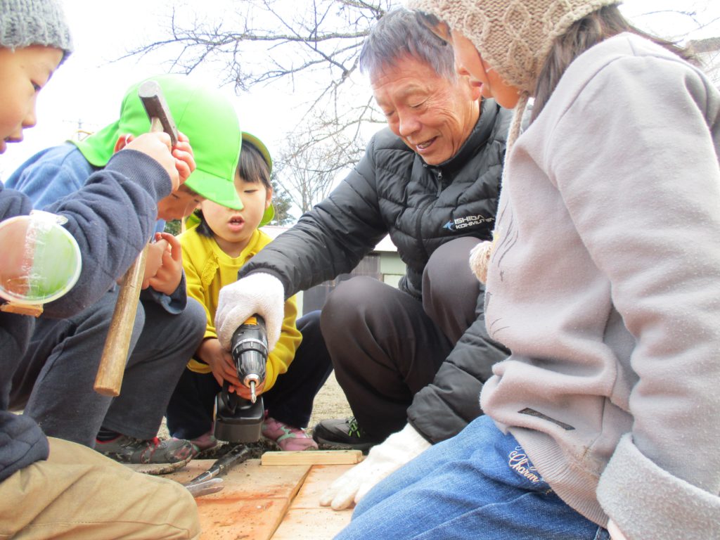 使うと音も出るしスムーズにネジは入っていくので子ども達のやってみたい気持ちも高まります。おじいちゃんに手伝ってもらいながら一緒に作業すると、「すごーい!すぐにネジが入っていったー!」と、道具の凄さを実感していました。