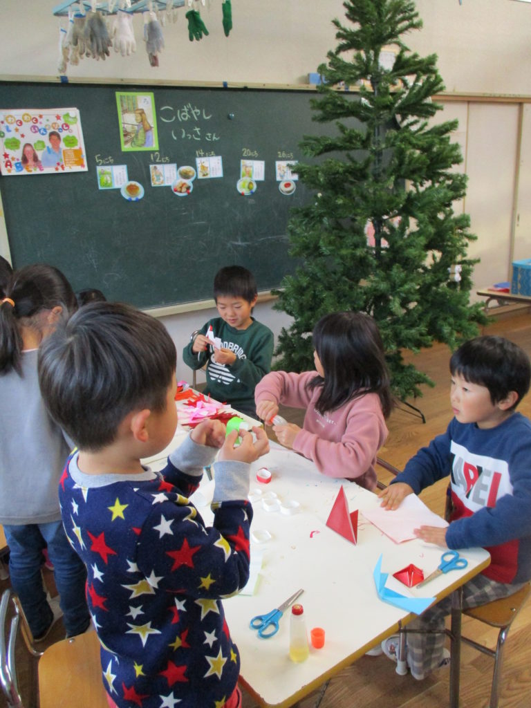 廃材や折り紙を使って飾りを作ります。今まで経験したことを思い出して作る子もいれば、クリスマスツリーには星がなくちゃと星を折り紙で切って作る子も。