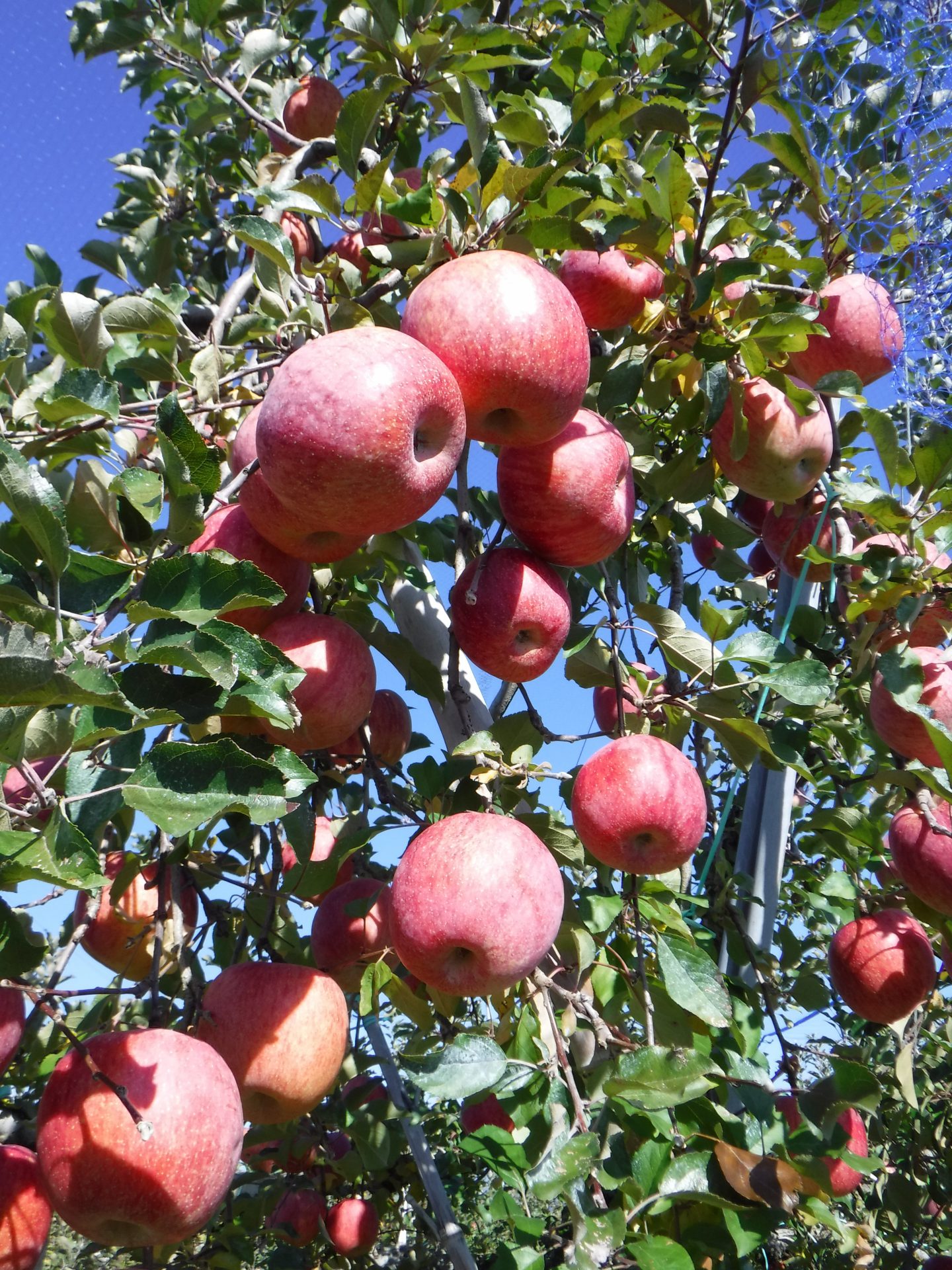 畑につくと、見事なりんごが青空いっぱいに広がっていました。