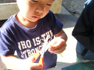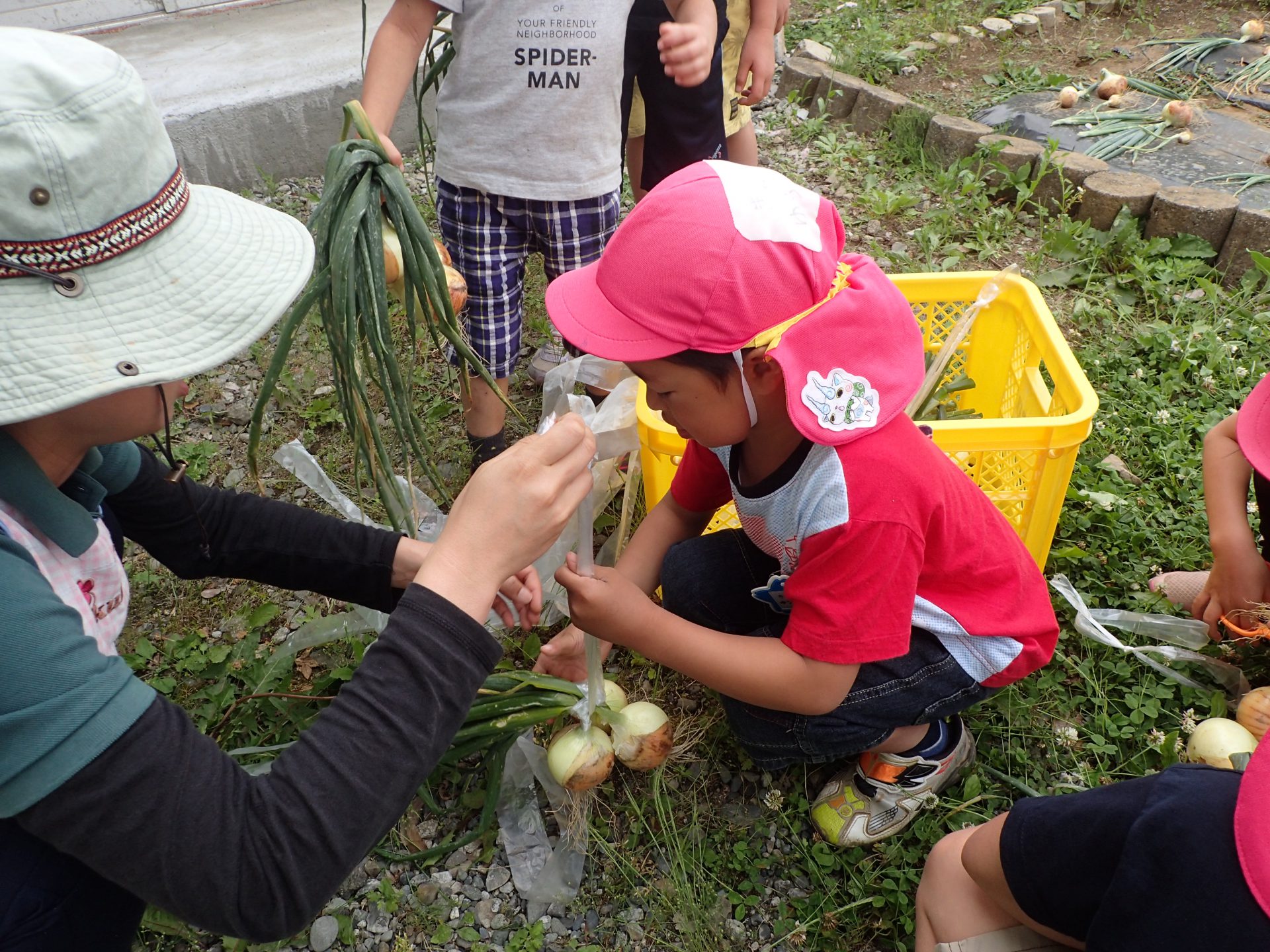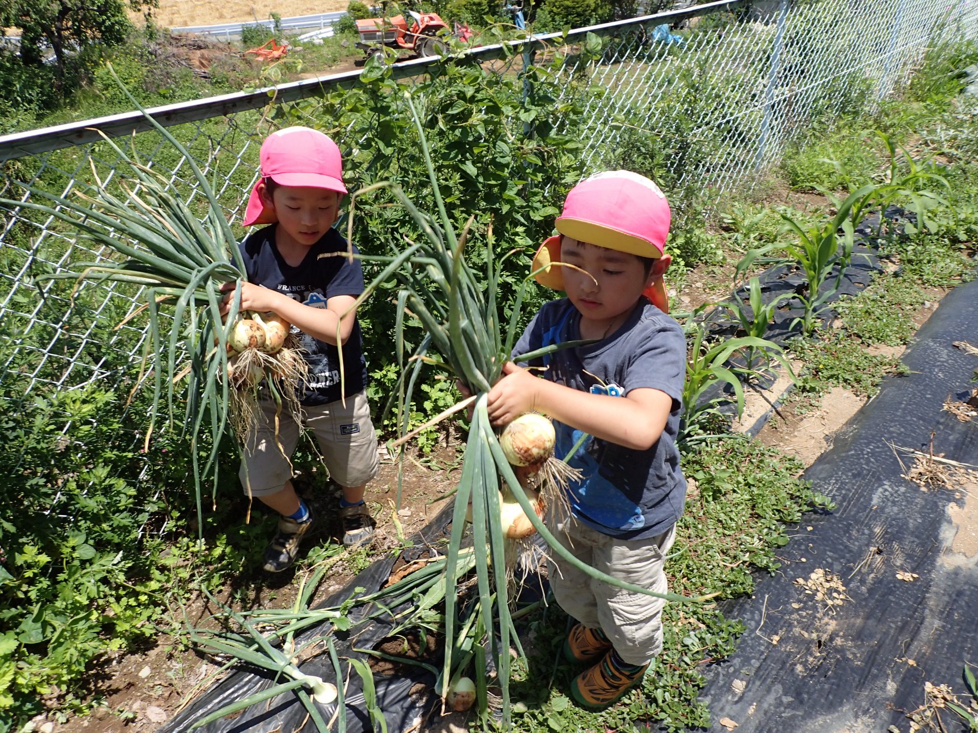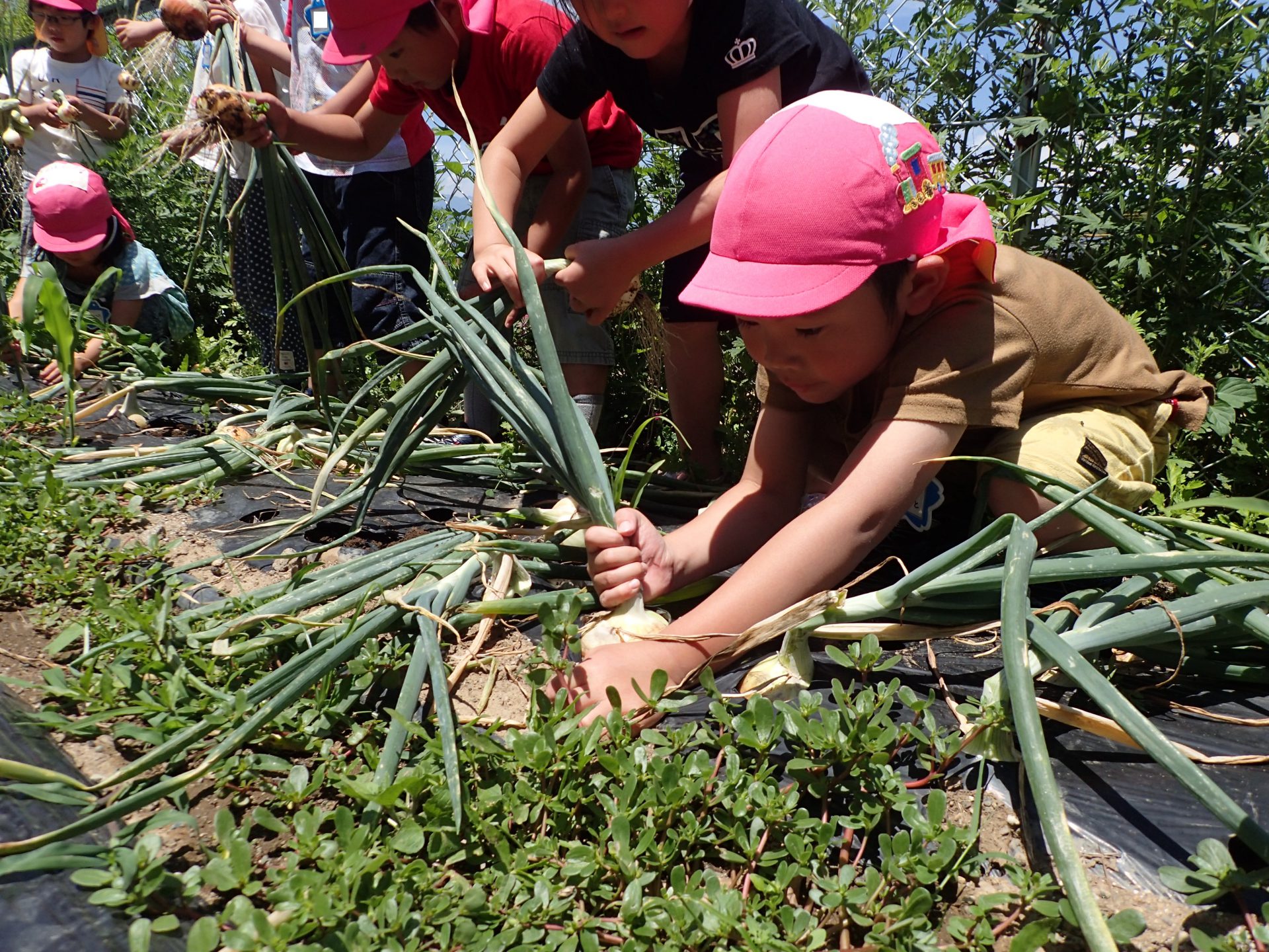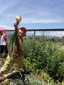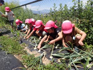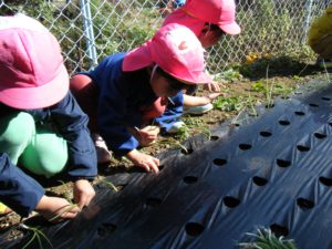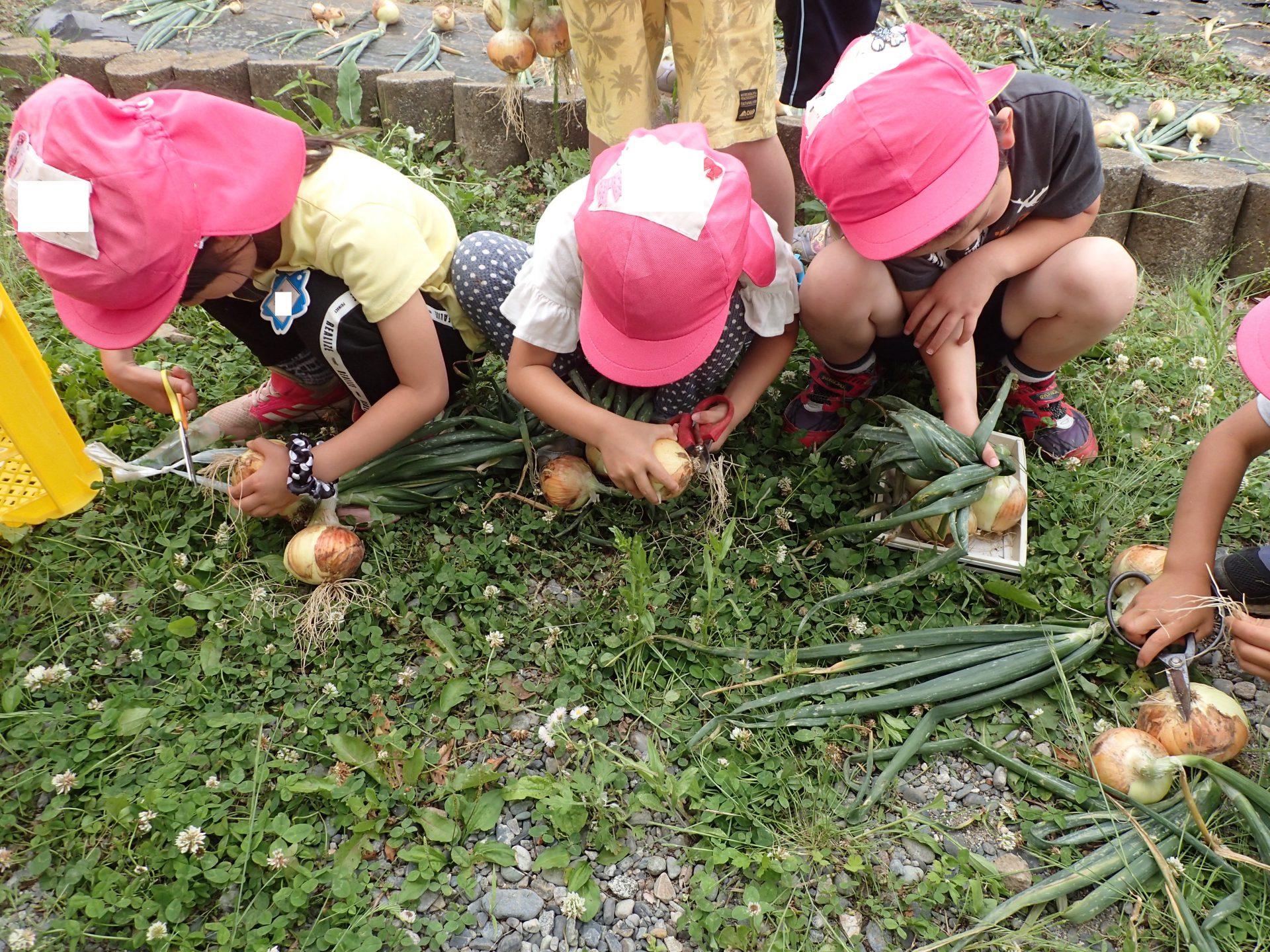 昨年の秋に玉ねぎの苗を植えました。よく育つように、子どもたちが苗の根切りをし、畑に植えました。