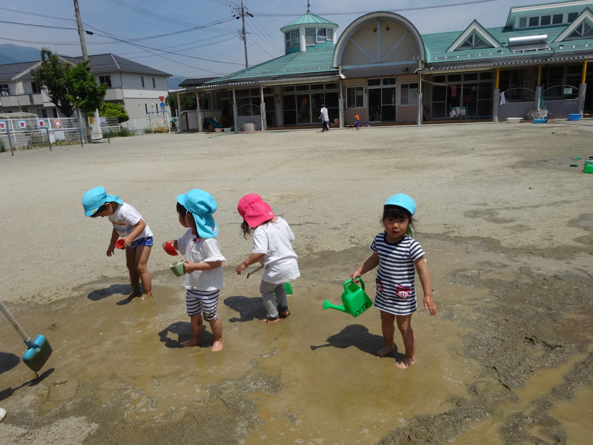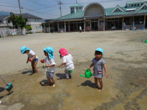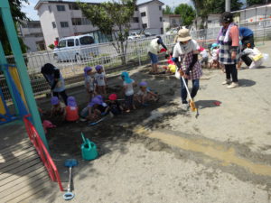 ホースから流れる水を触ったり、自分でジョウロで汲んだ水をトンネルに流したりそれぞれの子どもが、今、興味を持っているあそびにひたりこめる時間を大切にしていきたいと思います。