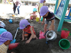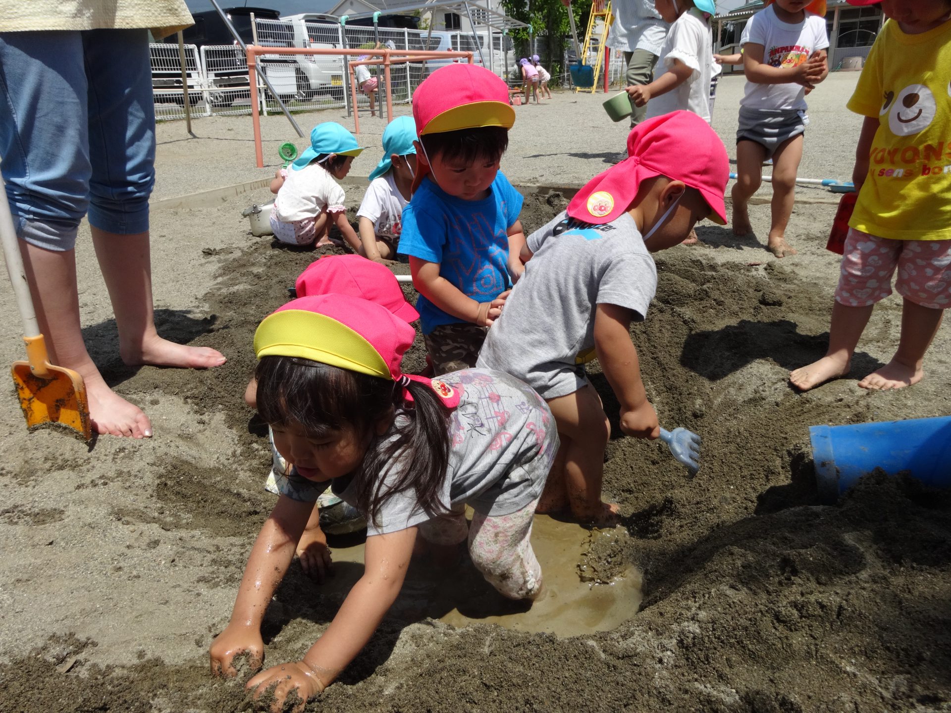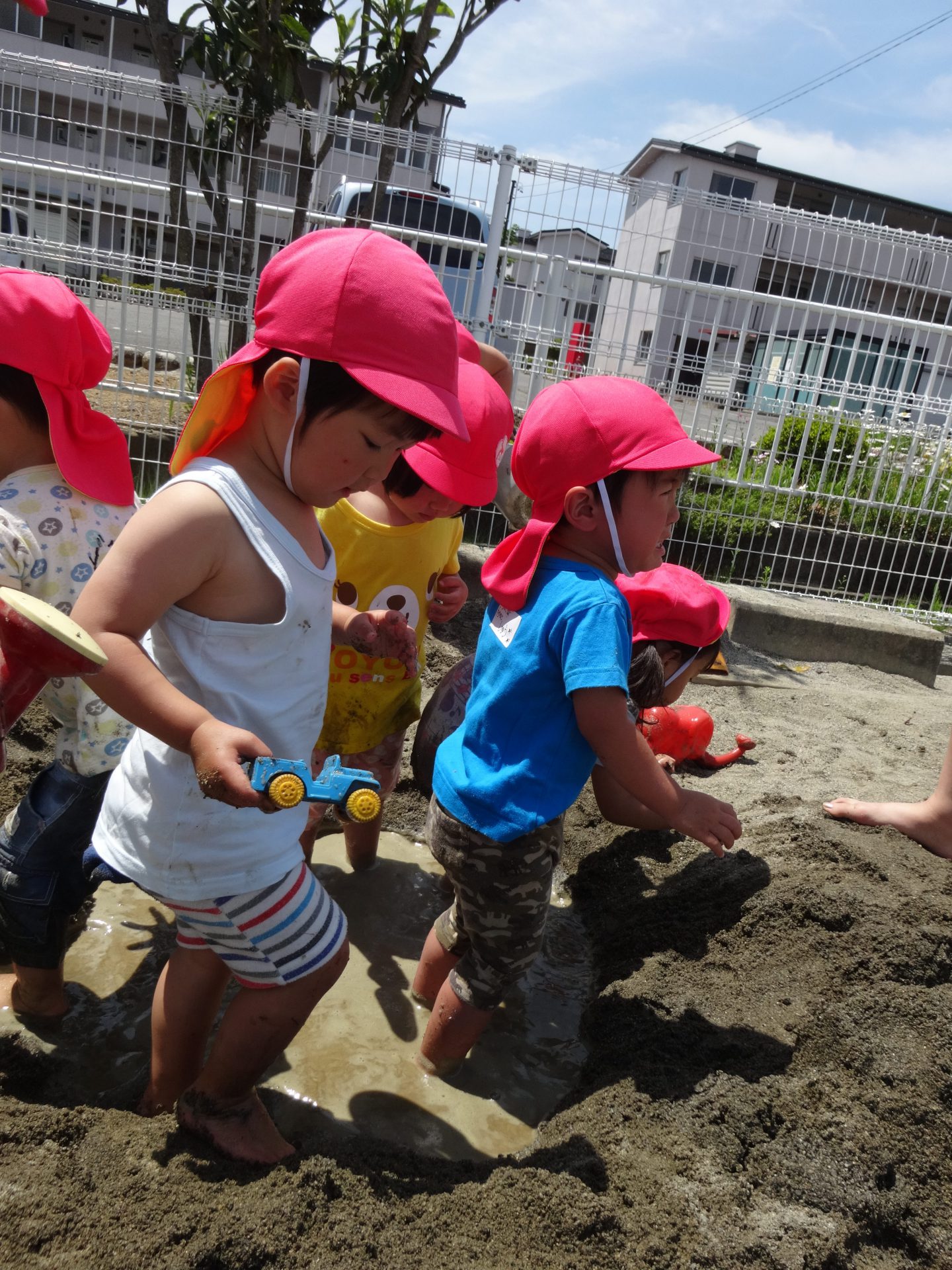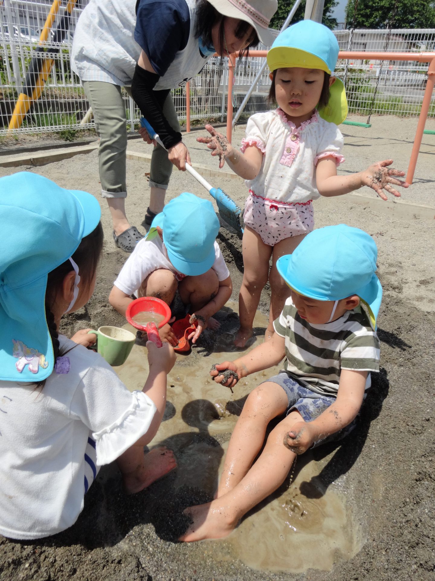 まだ砂や泥の感触に慣れていない子もいますが、友だちが楽しそうに遊ぶ様子を見て少しずつあそびに入れるようになってきています。