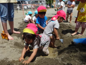 協力して山や川を作る子がいる一方で、意見が合わなかったり道具の取り合いをしたりする子もいます。低年齢ならば保育者が仲立ちすることもありますが、なるべく子ども同士のやり取りを見守り、自分たちで解決する力を養っていきたいと思います。