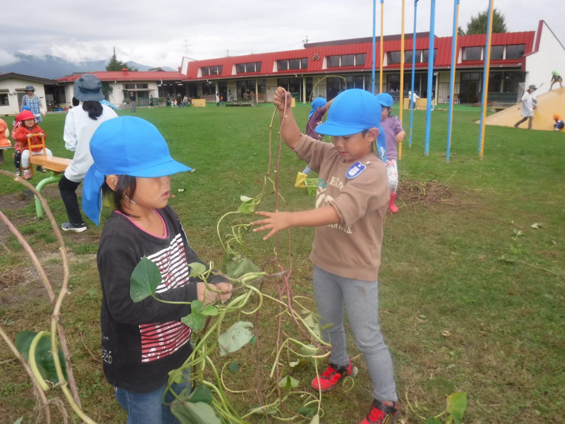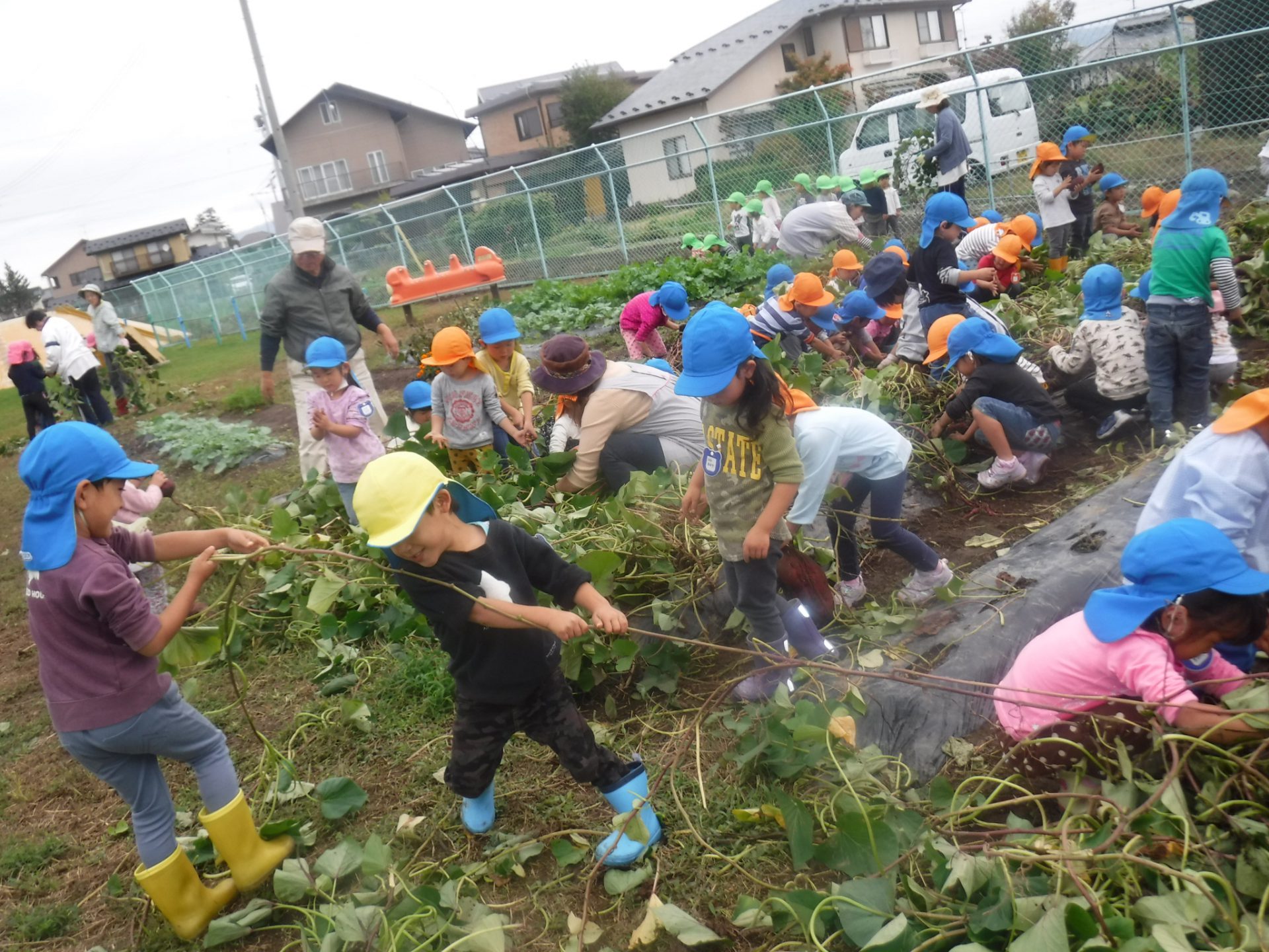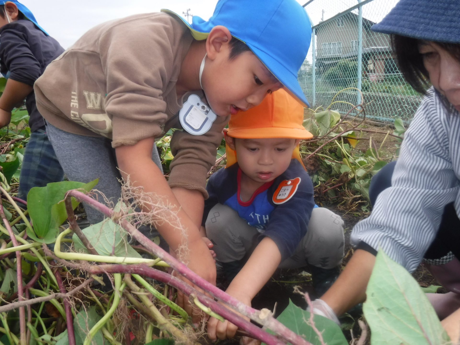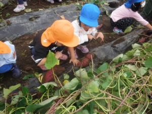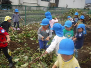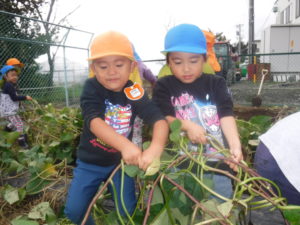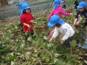 夏に植えたさつまいもが大きく育ち、収穫の日。