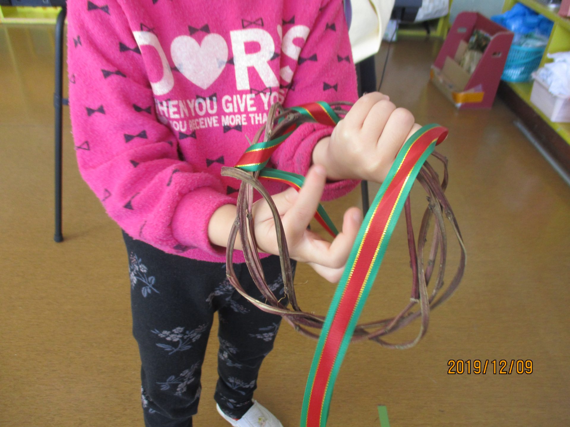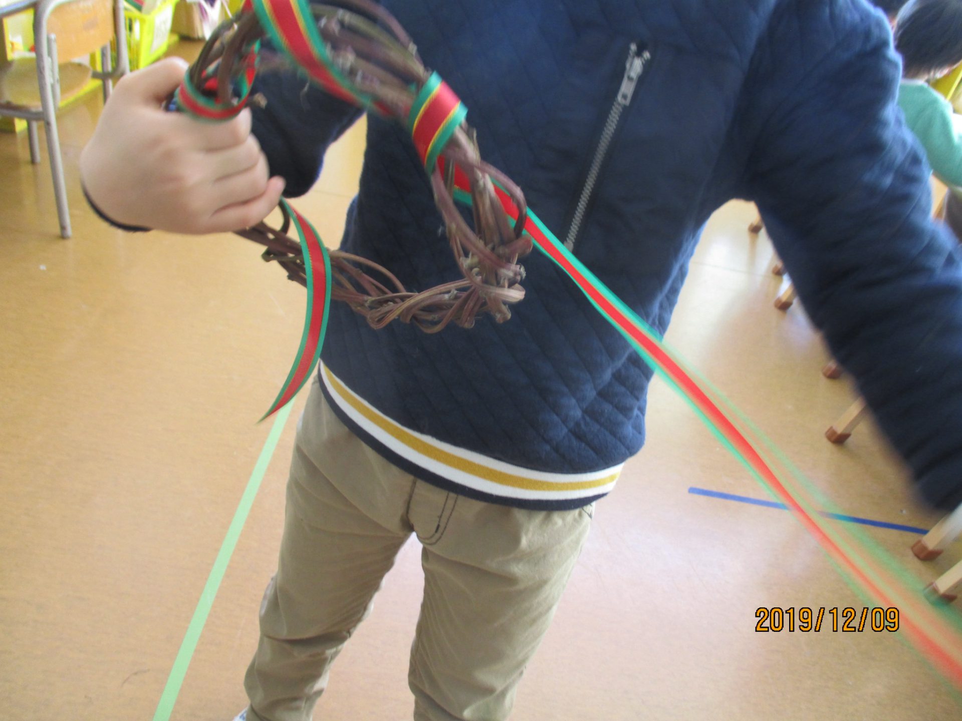 「先生、何やってるの?」『これを丸くするとリースになるんだよ』