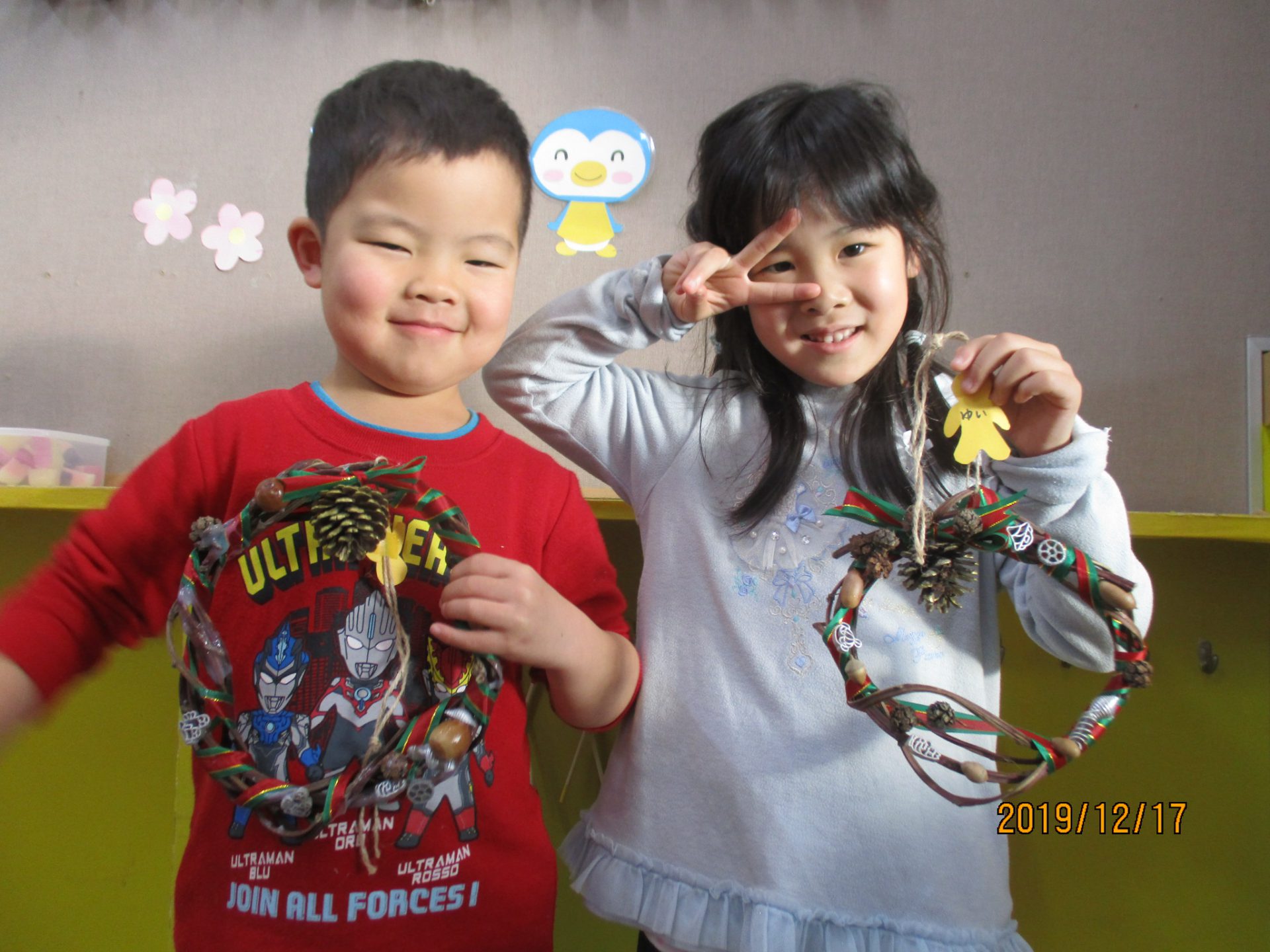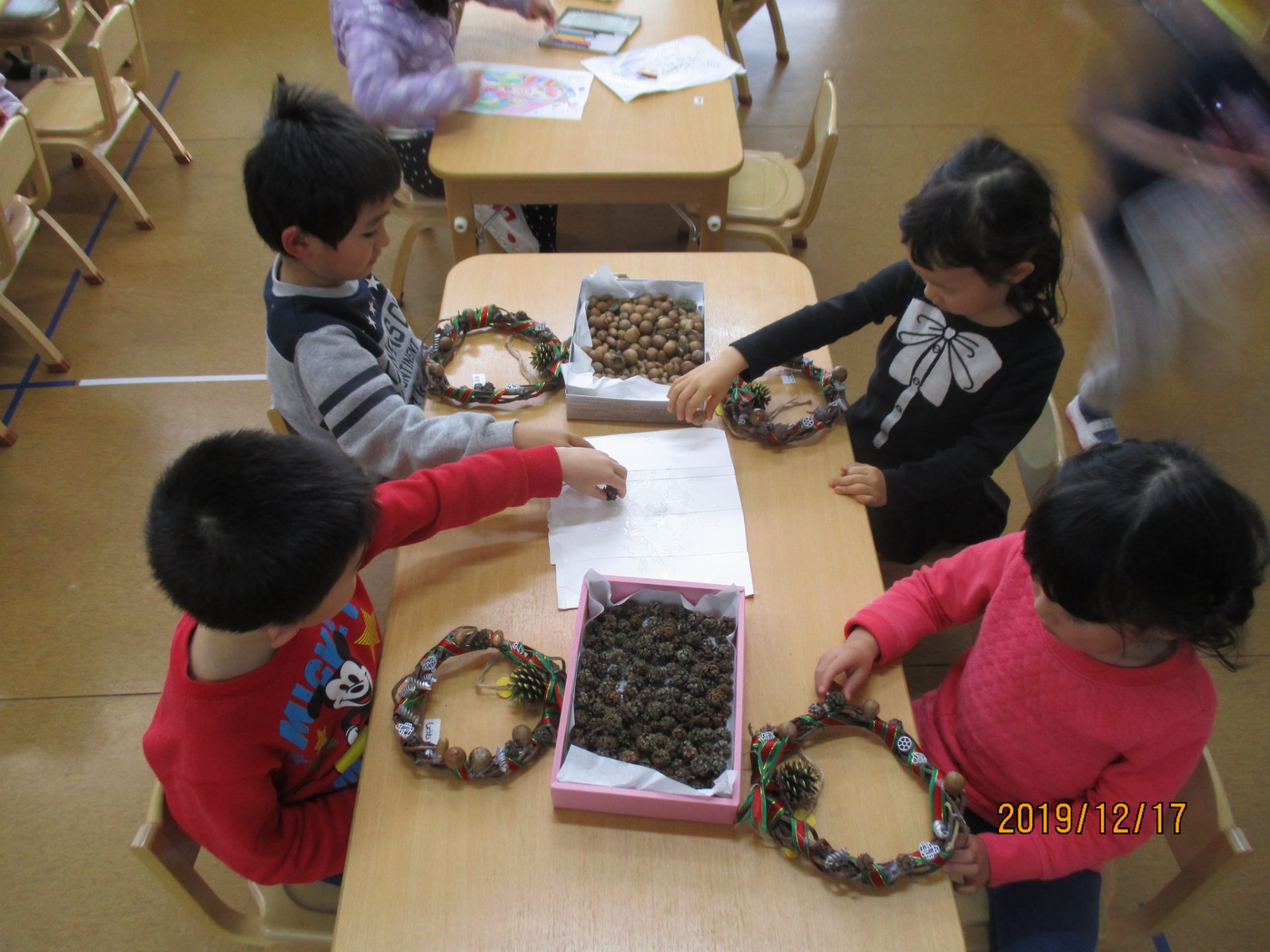 クリスマスにむけてリースを作った年中さん。
