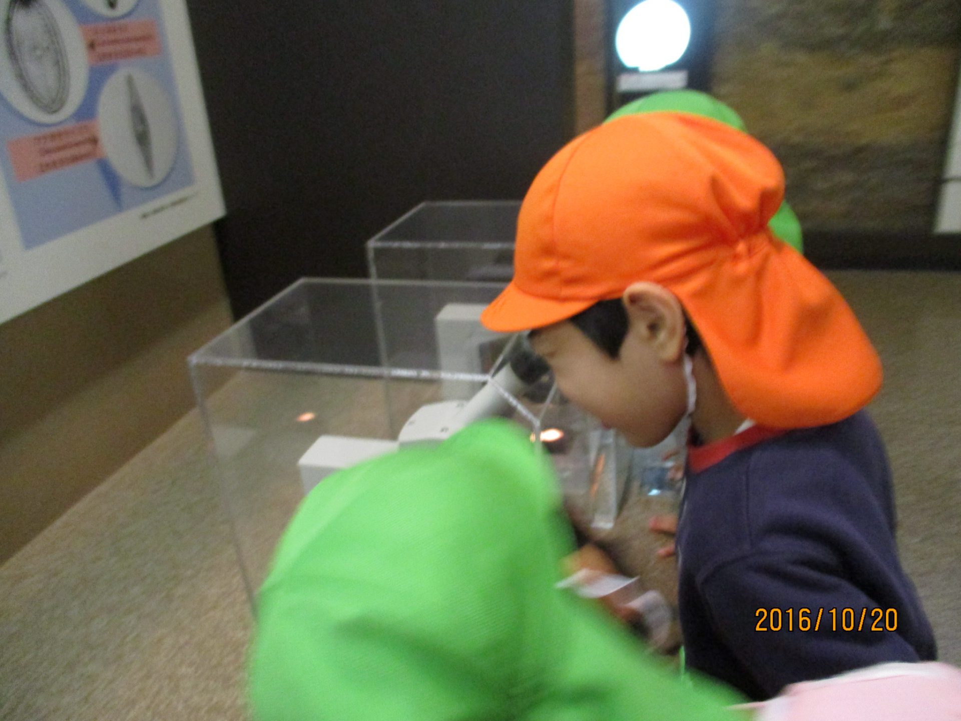「いろいろな魚がいたんだね。」顕微鏡をのぞいて「花粉の化石だって!よく見える。」