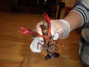 子「あっ!大変何かついてる!?」子「お母さんザリガニに卵がついてる!」と11月にお腹についている卵に気が付きました。