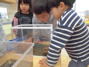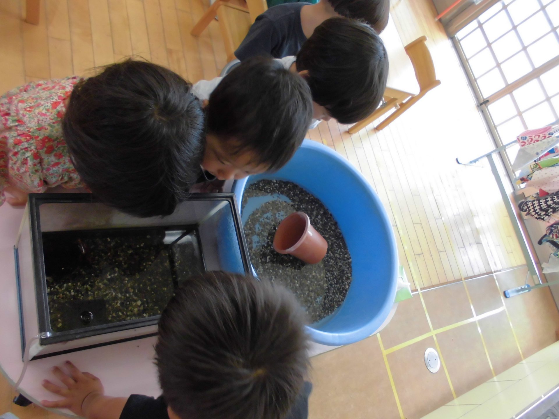 子「ザリガニさん♡おはよー」と登園すると水槽の中をのぞきこみ、興味津々、観察をする日々が続いていました。