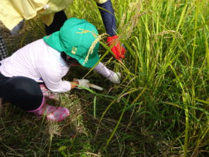 稲刈り鎌を使って稲を刈ります。「すべっちゃって上手に刈れないよ・・」「大丈夫。ゆっくり自分のほうに引いてきてごらん」