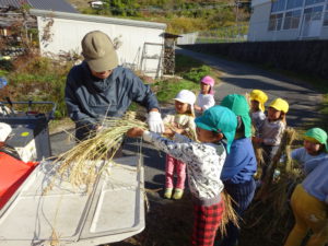 さあ!今日は脱穀です。お隣の清水さんが脱穀の機械を貸してくれました。「すごい!すごい!機械がお米を食べていく~!」
