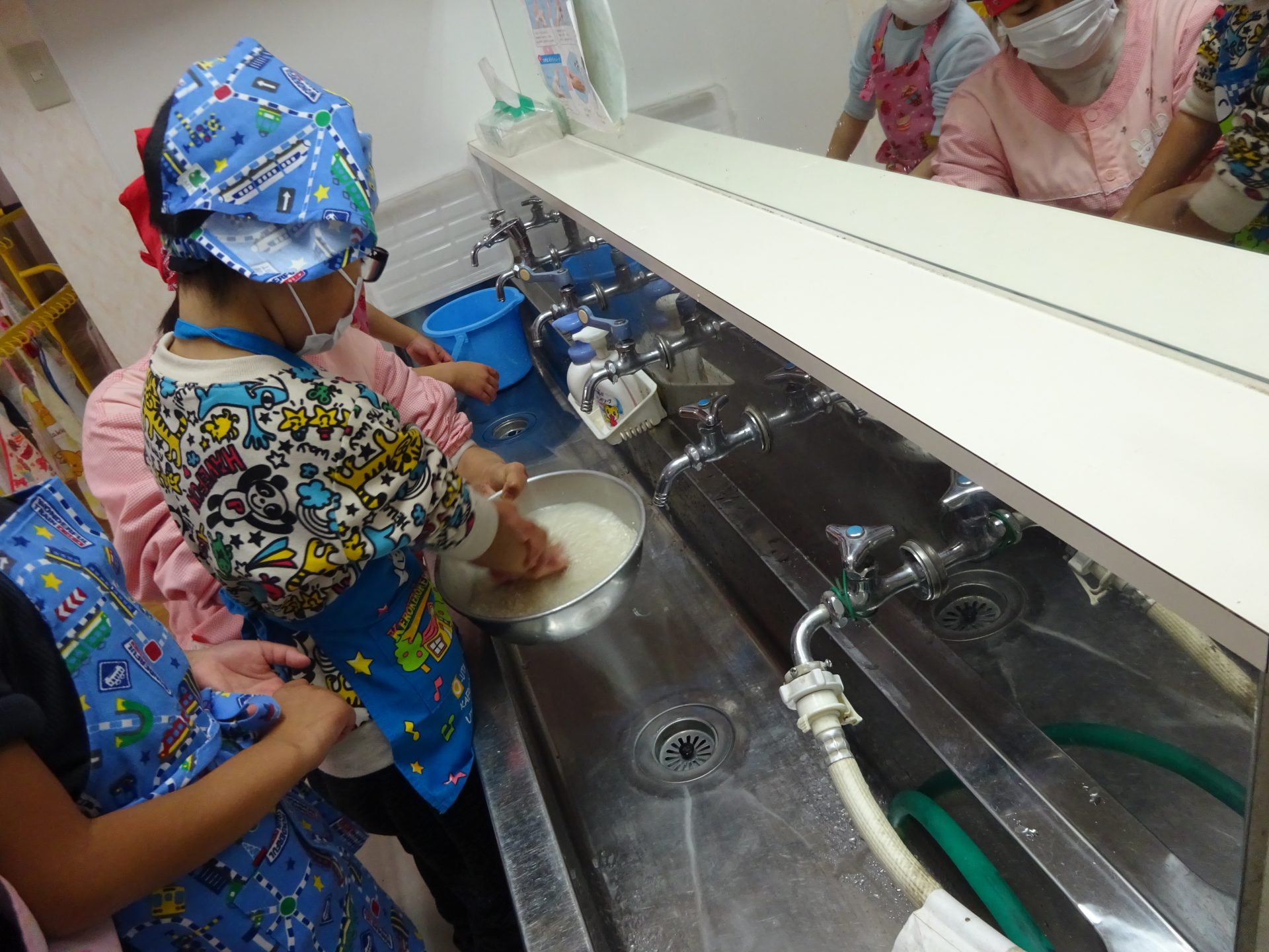 お米を使っておいしいごはんを炊こう。「お米をこぼさないように洗うんだよ」「あれ~?お水が白くなる」「何回か洗うとお水が透明になってくるね」