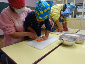 野菜をお料理しておいしい汁も作ろう。包丁を使ってお料理に挑戦!「猫の手、猫の手、指を切らないように気を付けて」「硬くて上手に切れないな・・」