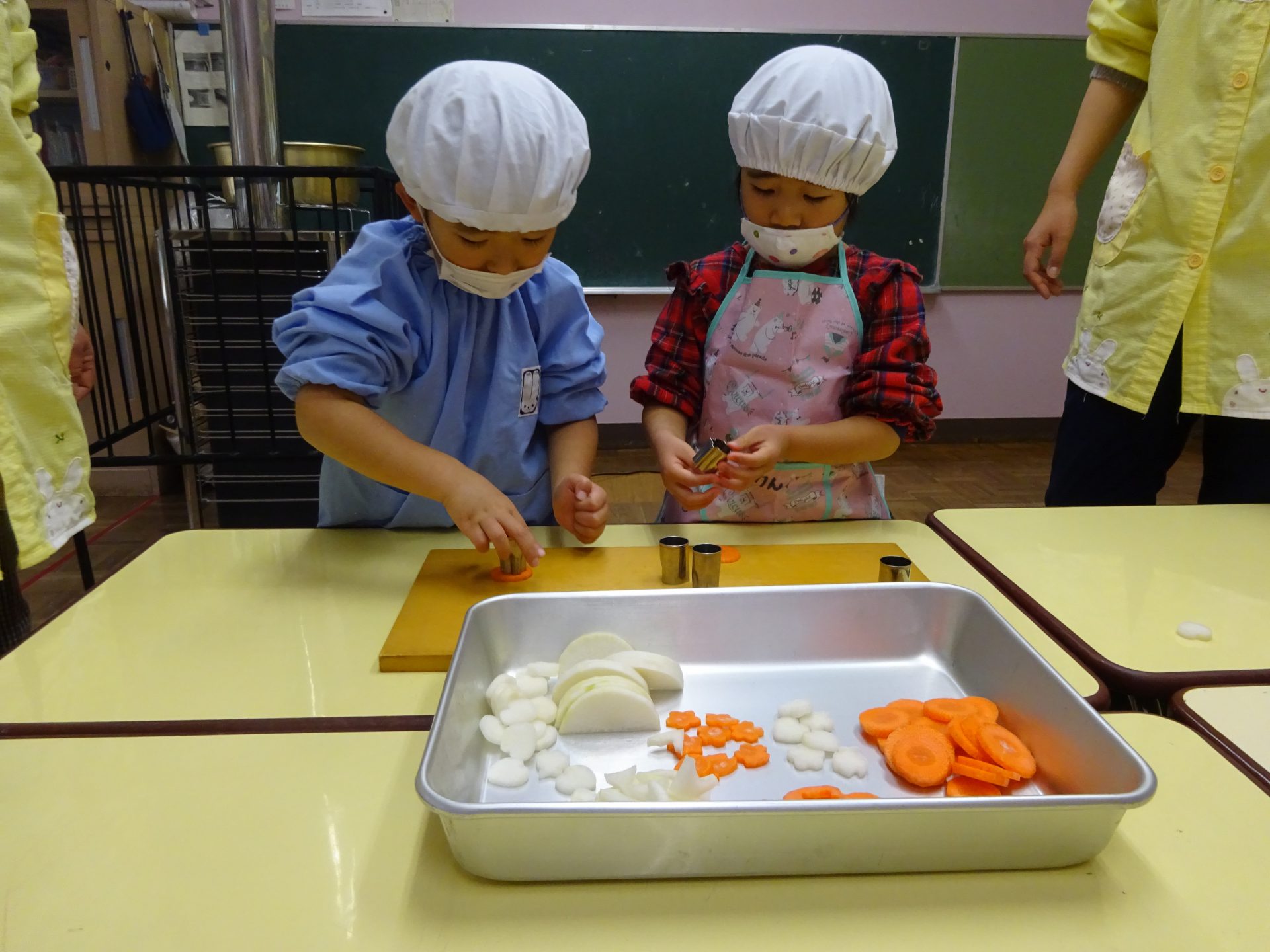 「ぞうさんみたいに包丁は使えないけど、ぼくたちは型ぬきでお手伝いをするよ。野菜をお花やハートの形にするんだよ。かわいいでしょ」
