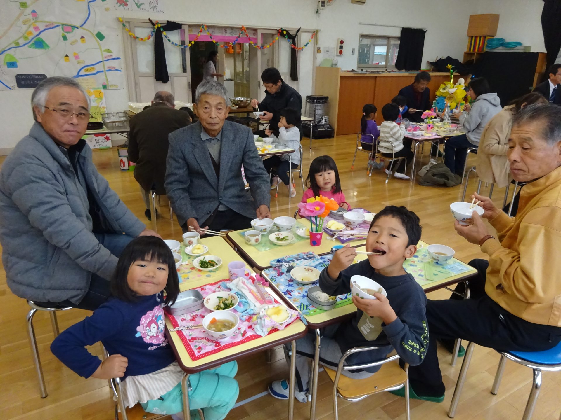 パーティにご招待した地域の皆さんと一緒に「いただきま~す」「お米が甘くておいしい!」「さつま芋も甘くておいしい!」「お田植がんばって良かった」「このにんじんはぼくが切ったんだよ」「大根のハートは私が作ったんだよ」地域の皆さんにも喜んでいただけました。