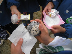 保育士 「かえる石にさわると雨が降るっていわれているよ」