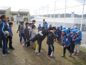 小学校の庭を通ると休み時間のお兄さんたちが声をかけてくれました。