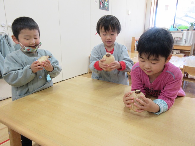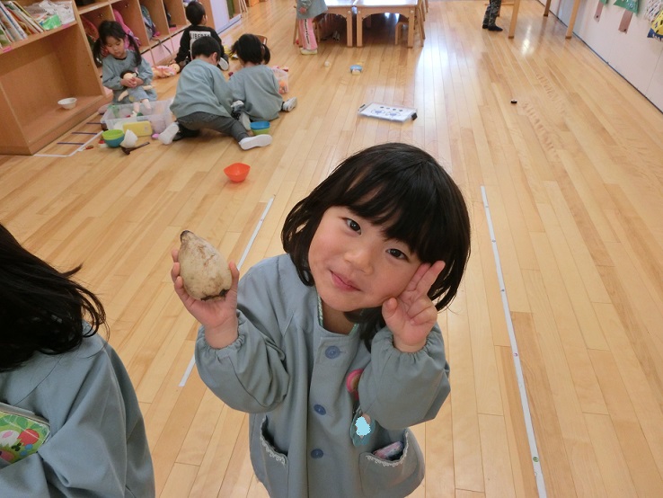 野菜を縦にしたり、横にしたり。不思議そうに見ている子もいました。