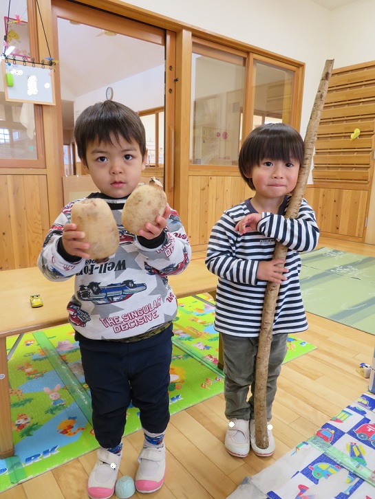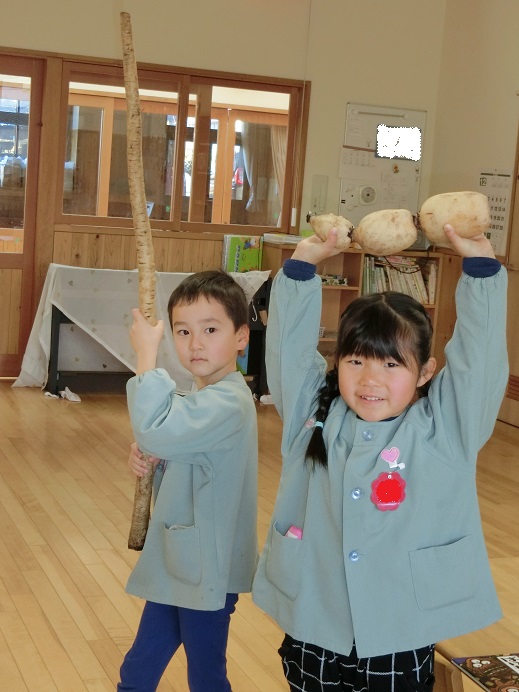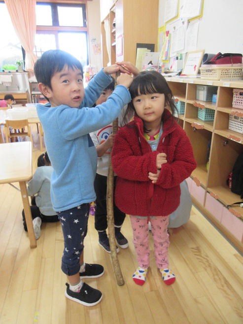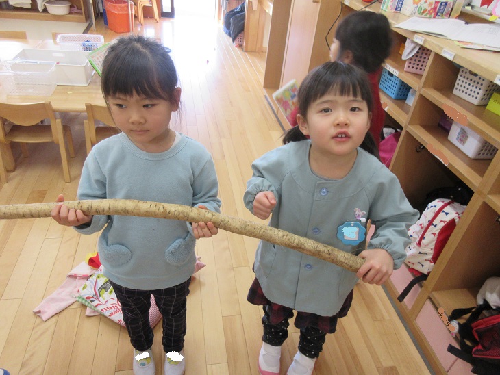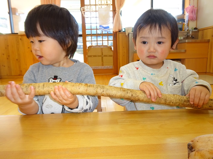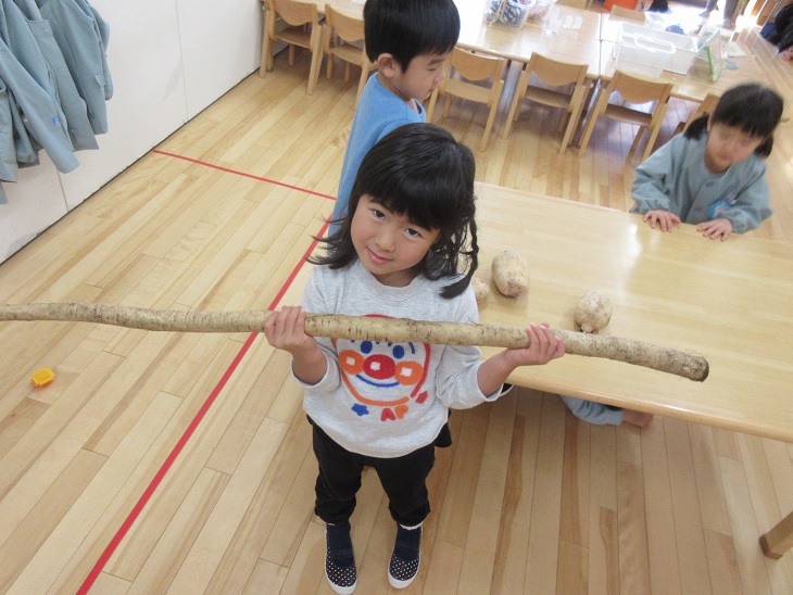 「ゴボウと背比べしてみよう!」「先生、どっちが高い~?」