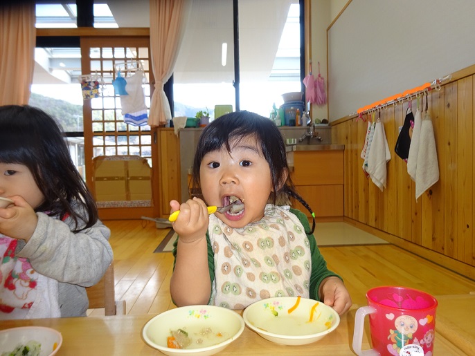 給食は「根菜のごま味噌炒め」というメニューでした。「さっき見たのはどれ~?」と保育士に聞きながら、子ども達は美味しそうに食べていました。