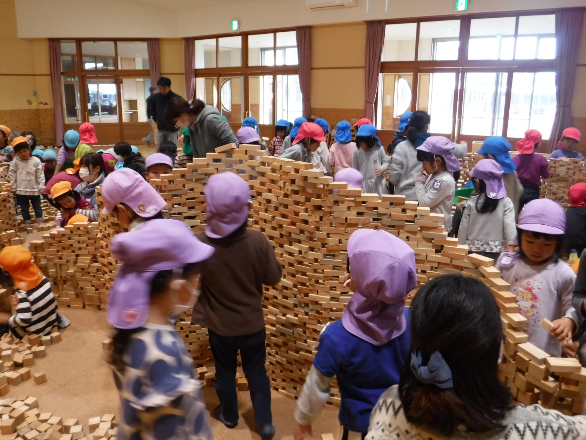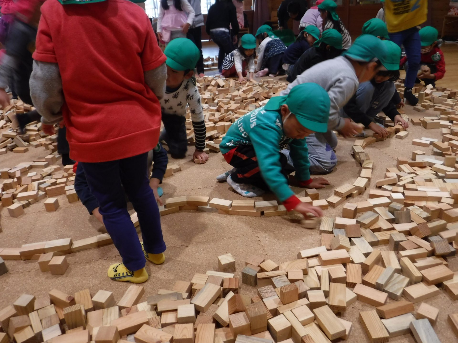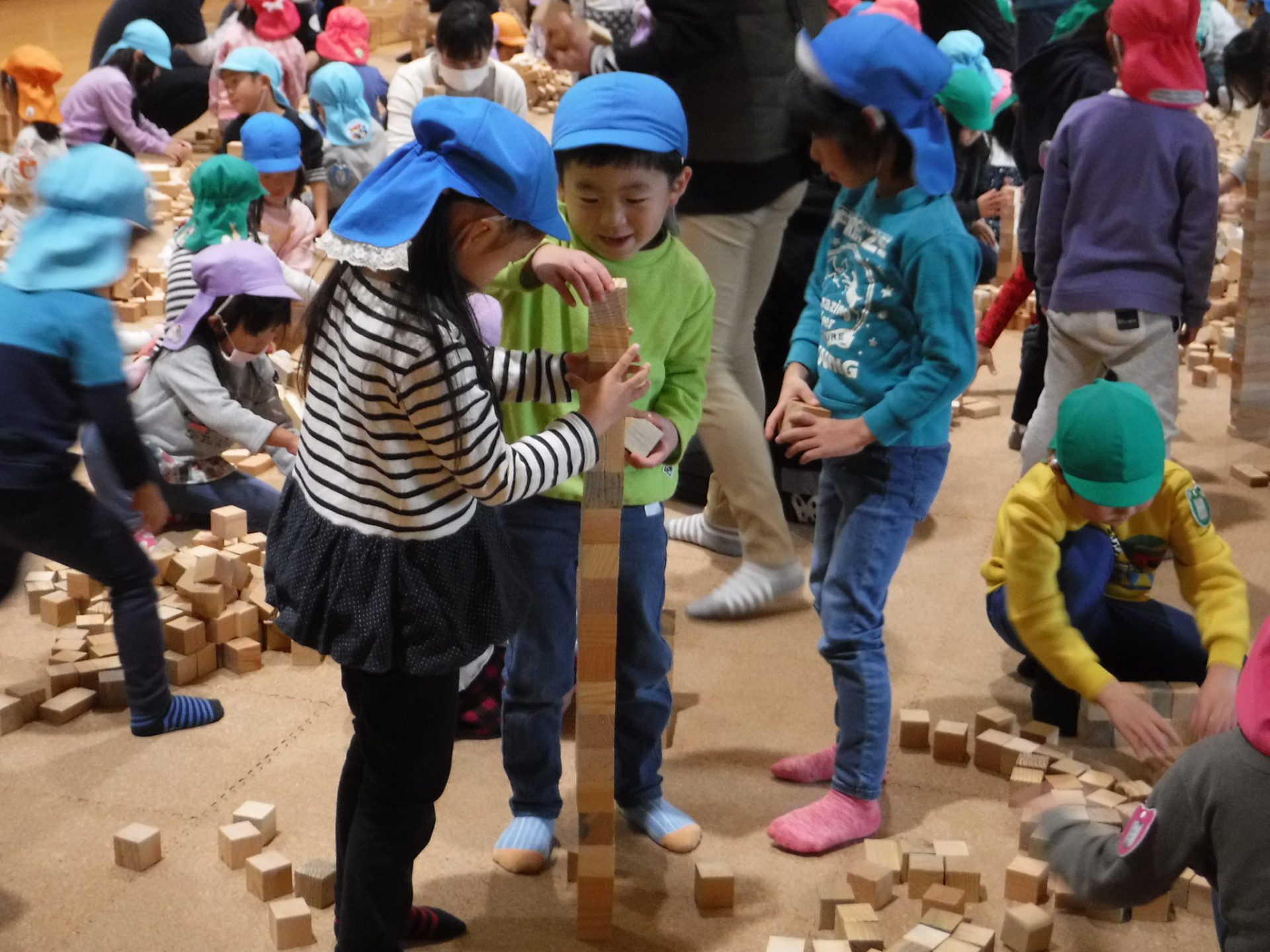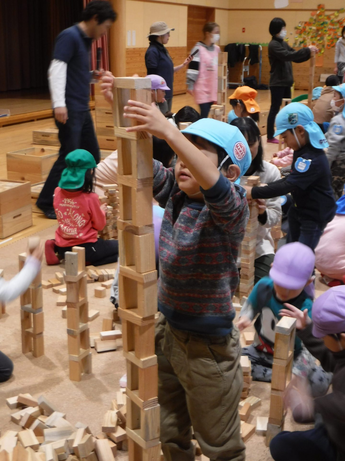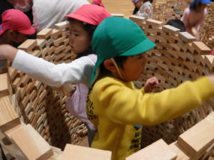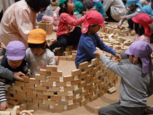 2万個のつみ木を使い、自分で積み上げたり、友達と一緒に見本を見て形になるよう工夫して作ったり