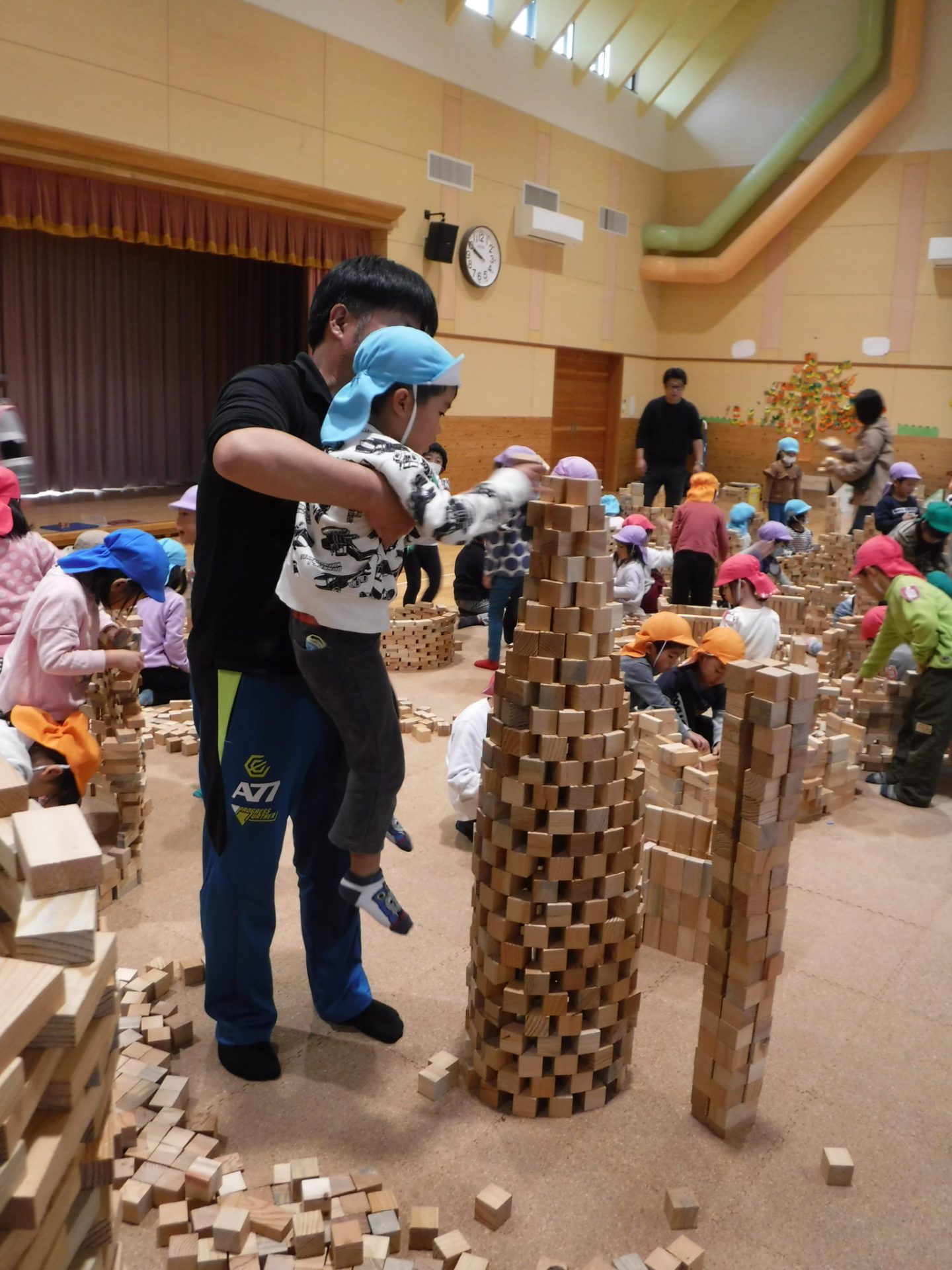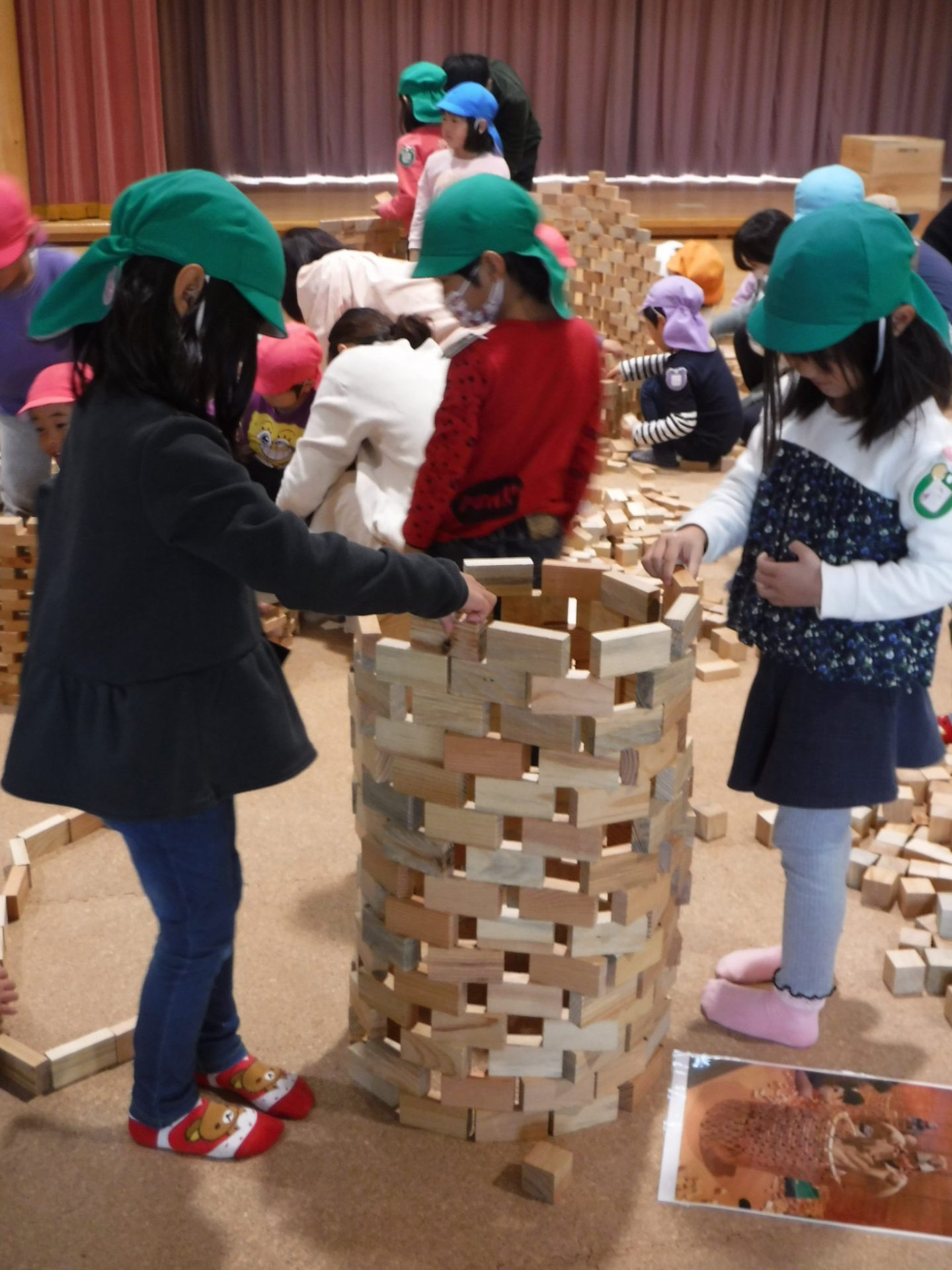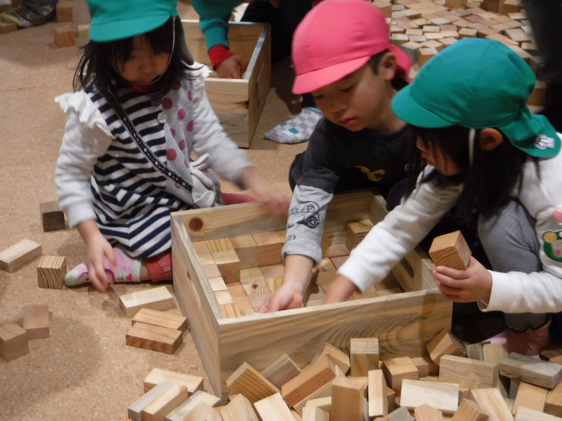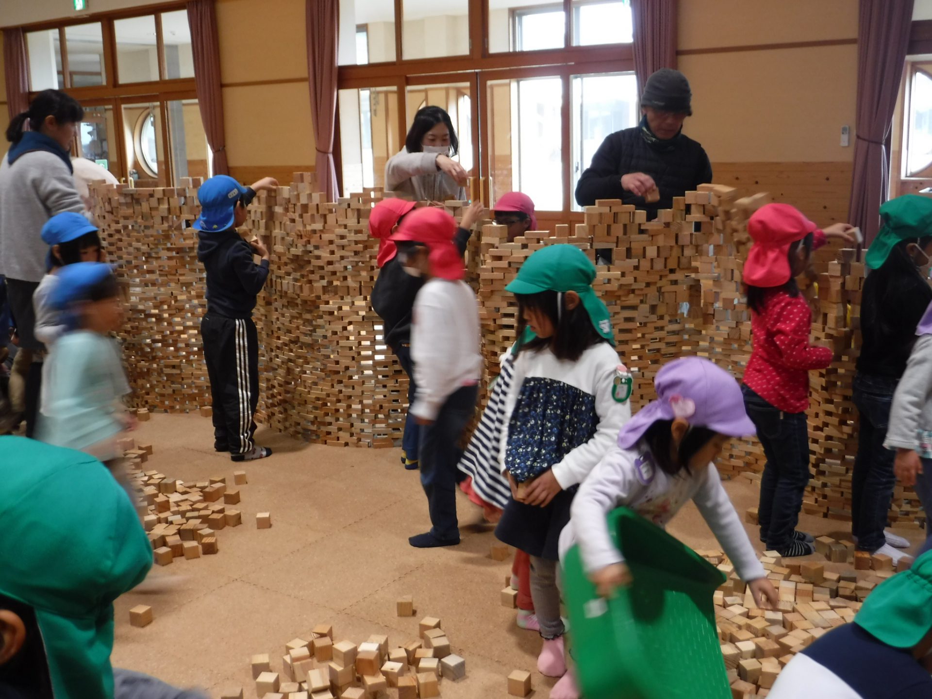 2万個のつみ木を使い、自分で積み上げたり、友達と一緒に見本を見て形になるよう工夫して作ったり
